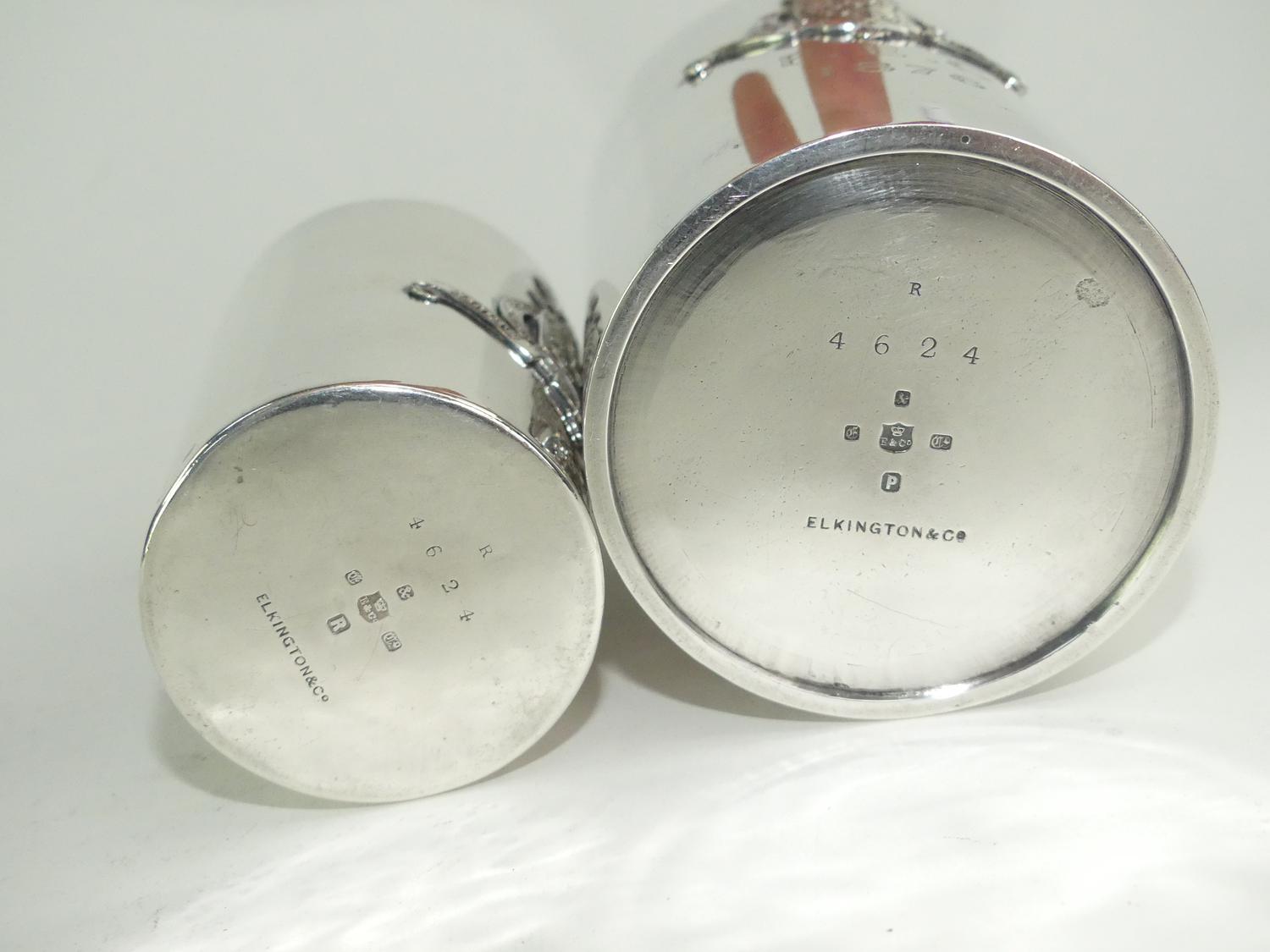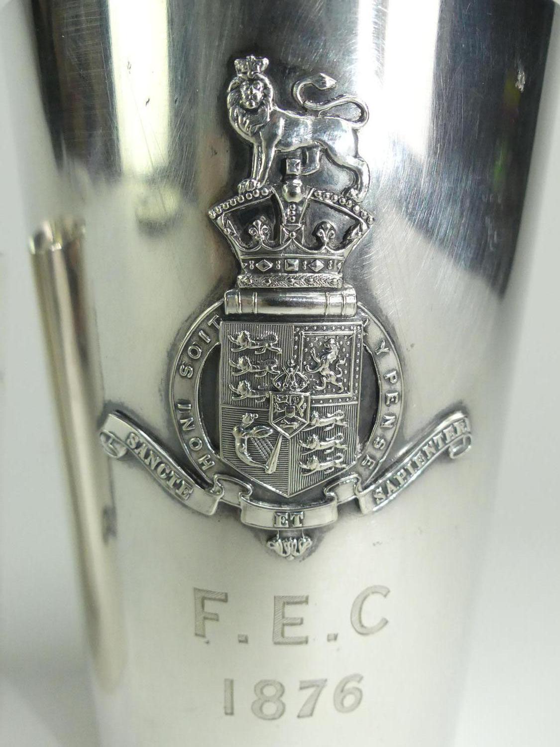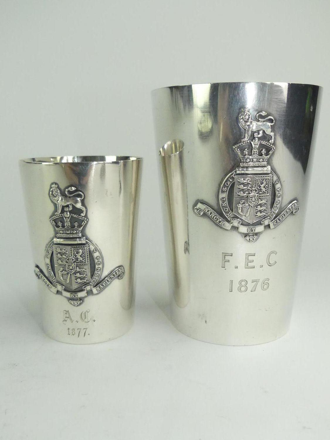two kings college, london silver plate tankards dated 1876 and 1877 by elkington & co., ht. 5" and smaller