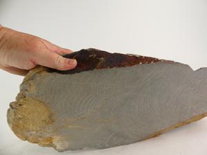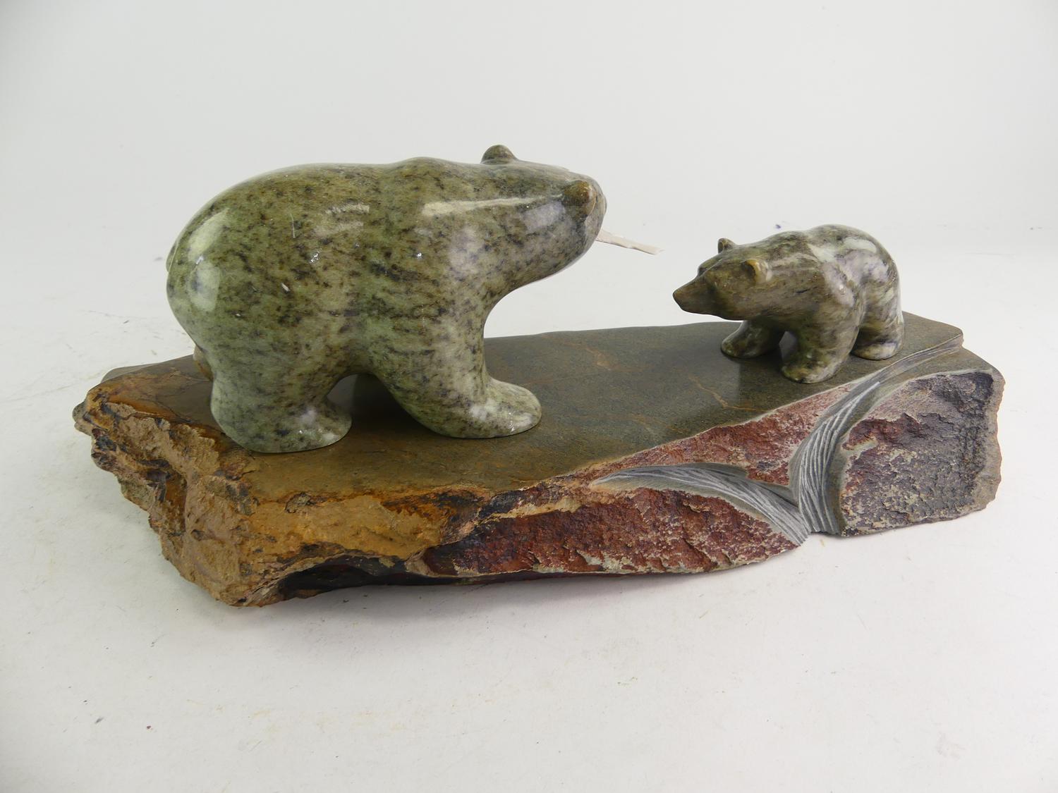 carved stone mother and cub bear fishing on stand, 18 1/2" x 6" x 6 1/2"