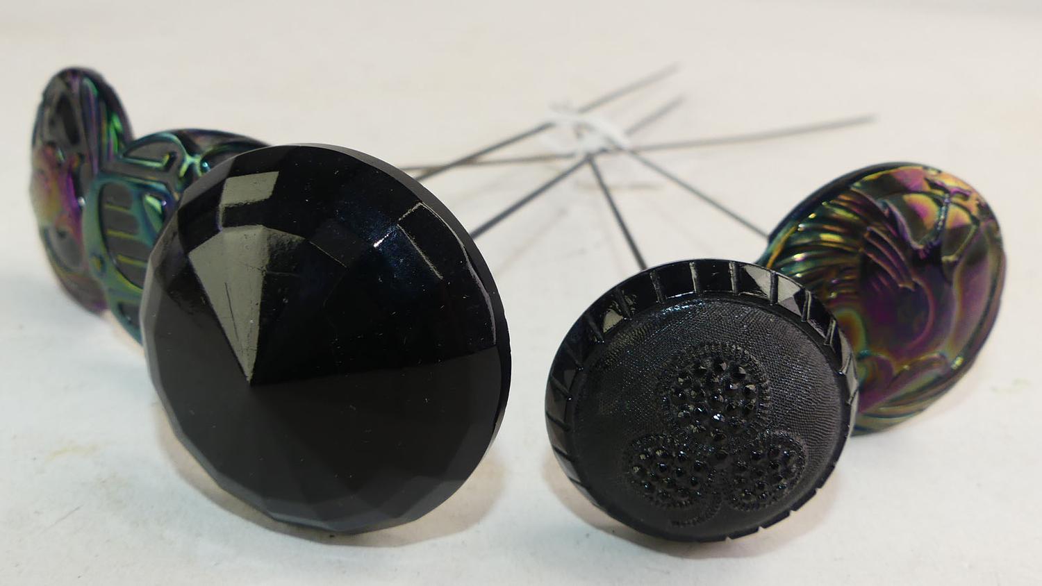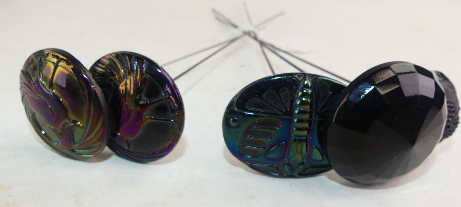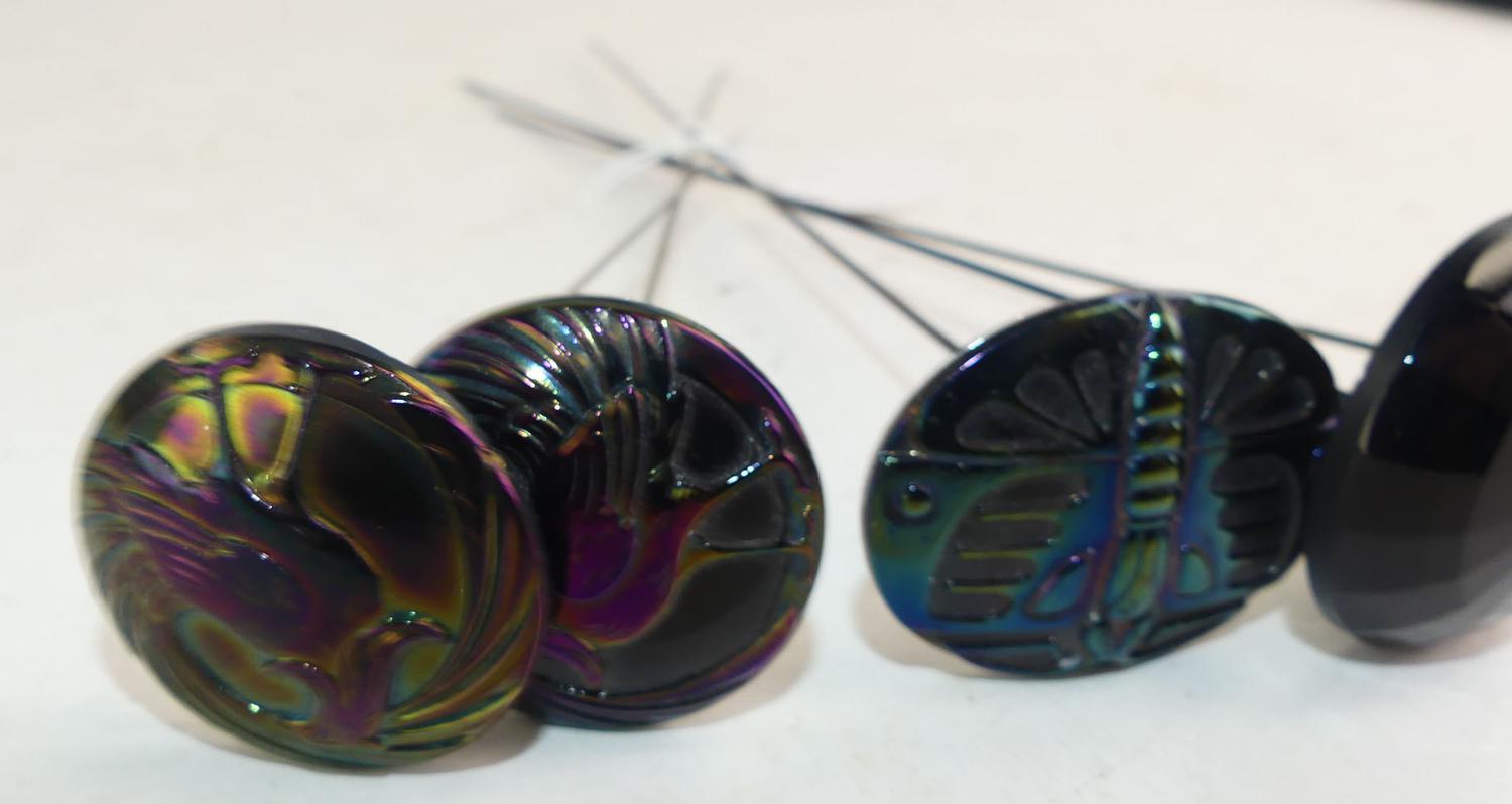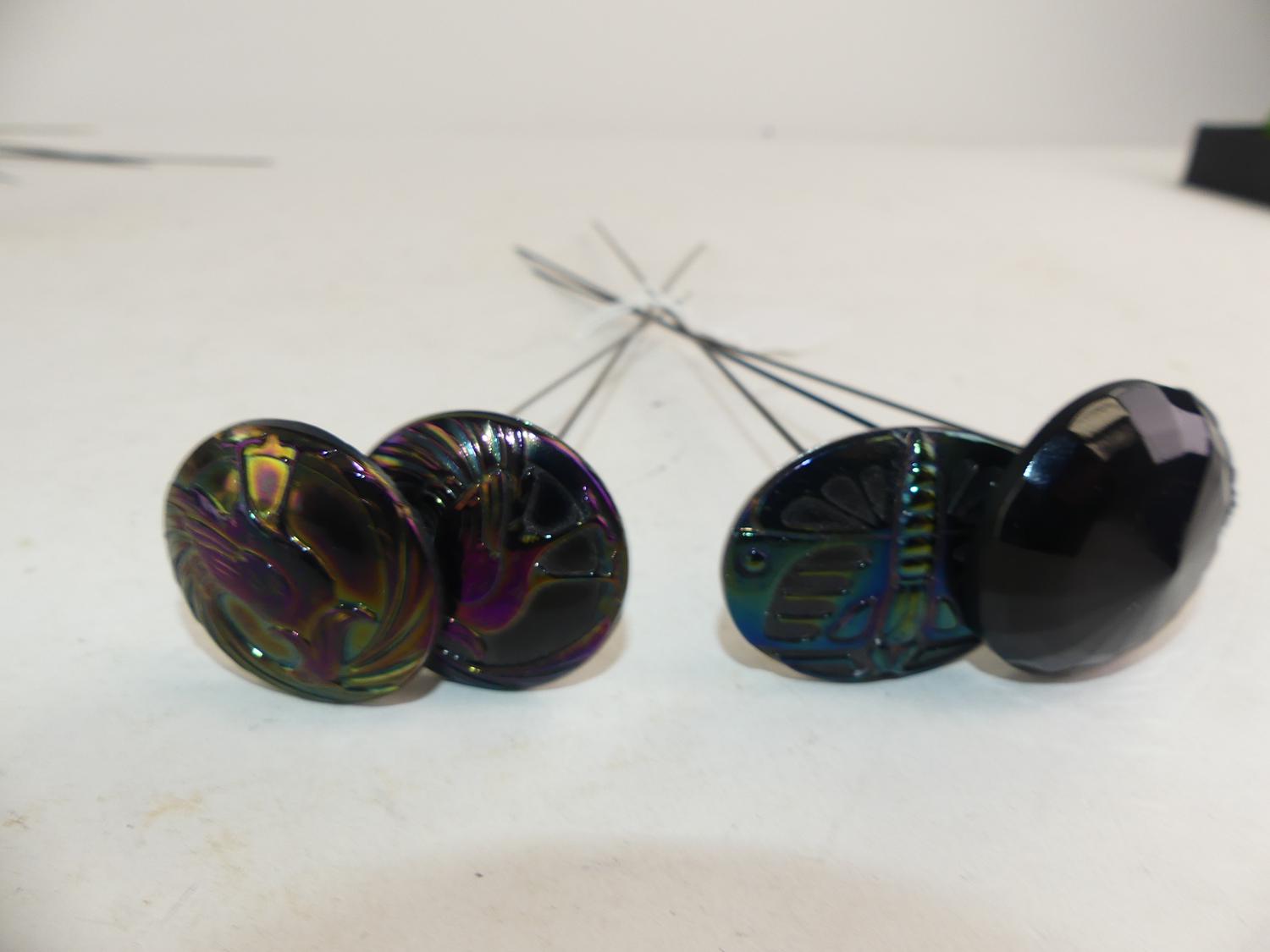 5 early 20th century carnival glass, hatpins, 10" and smaller