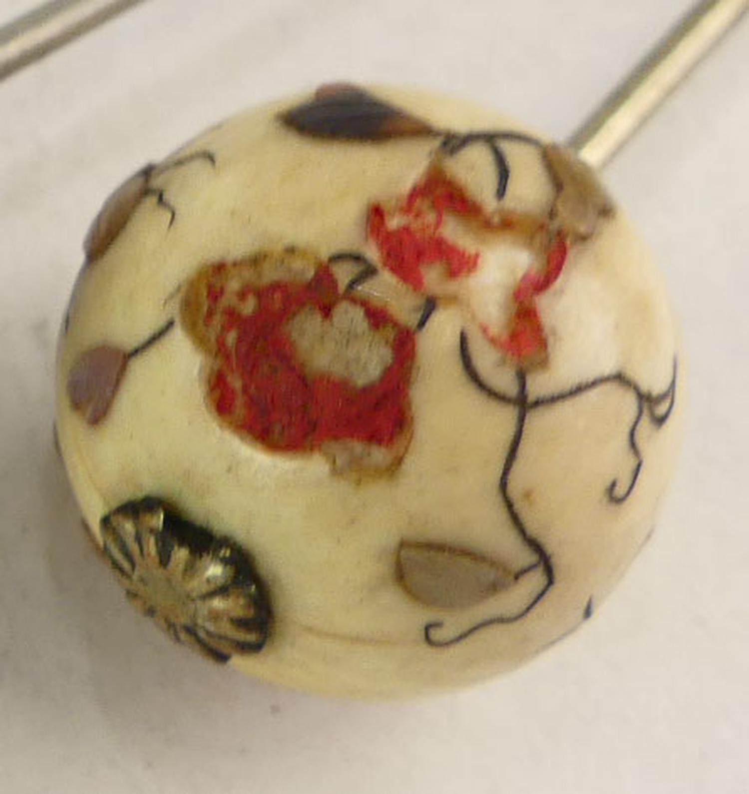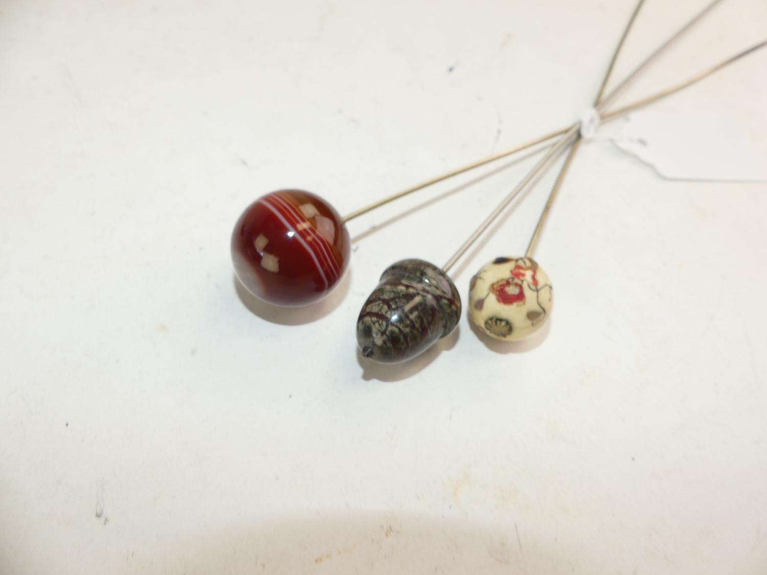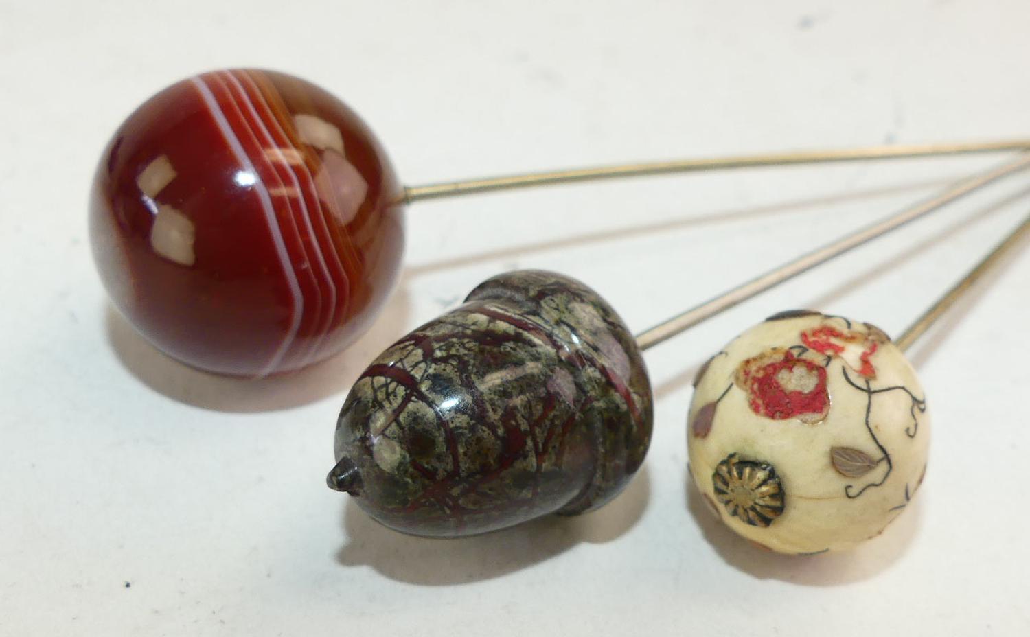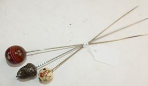 3 vintage hatpins including banded agate, 9 1/2" and smaller
