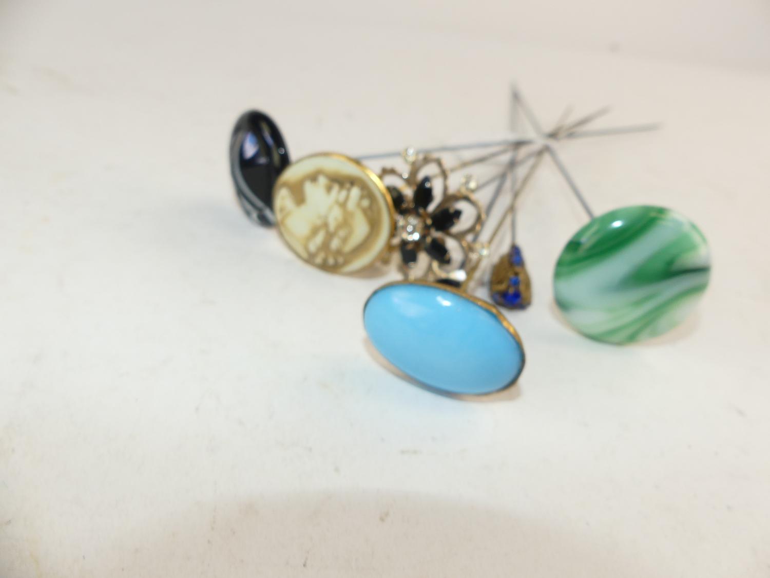 7 vintage hatpins including cameo on glass, 11" and smaller