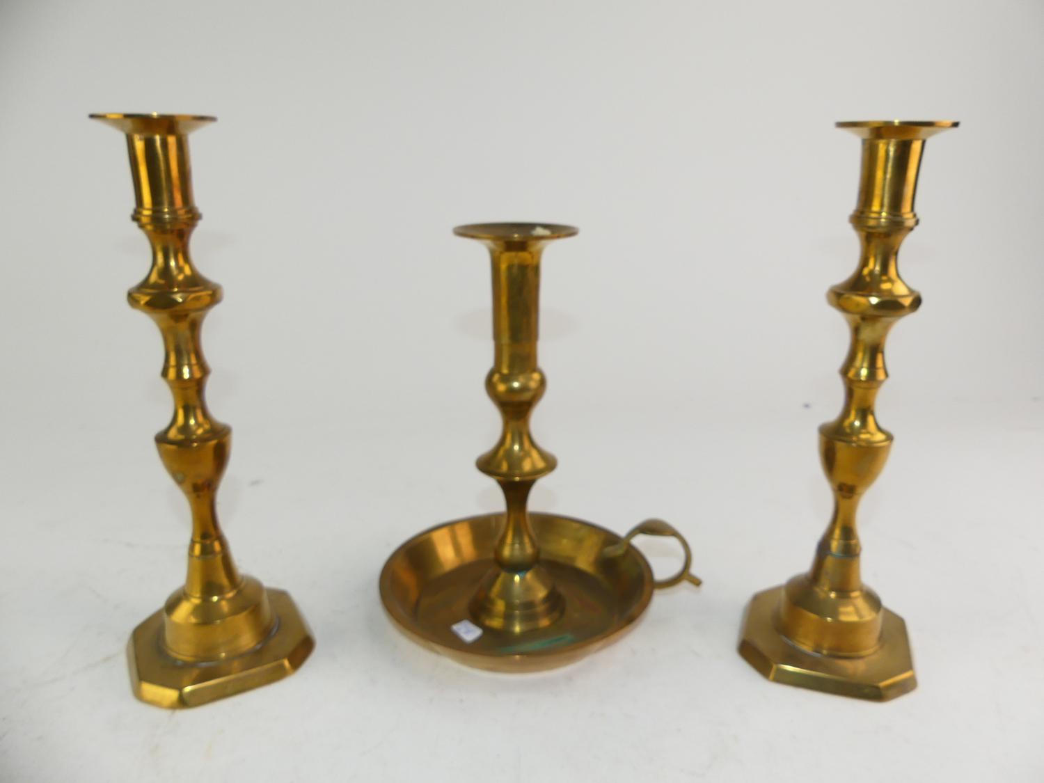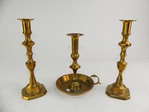 pair of brass candle sticks and a chamber stick