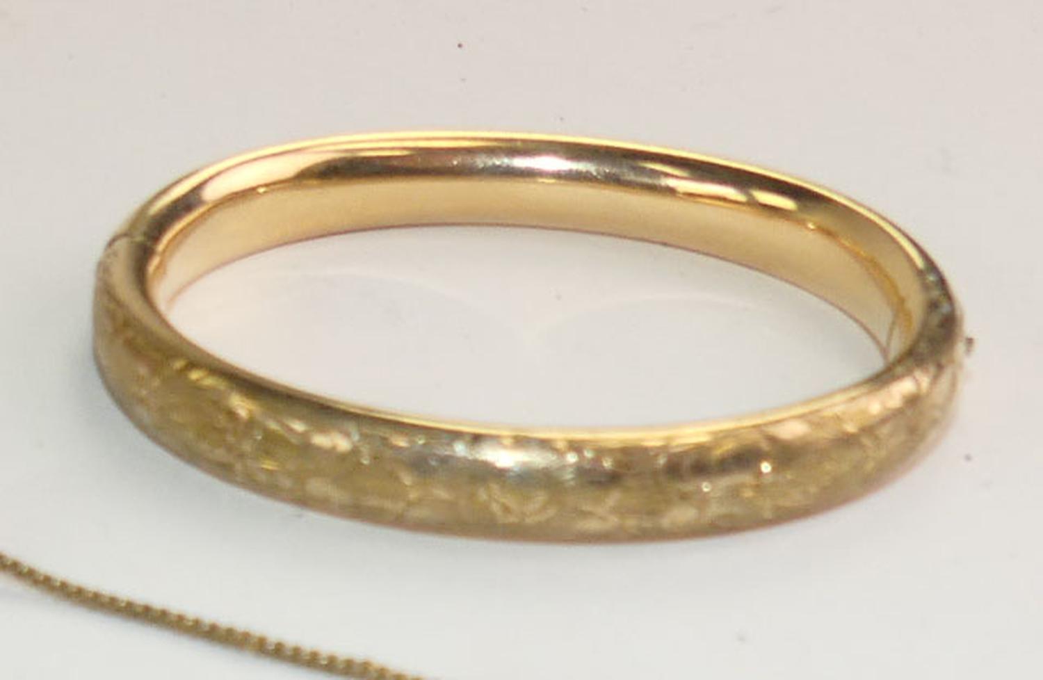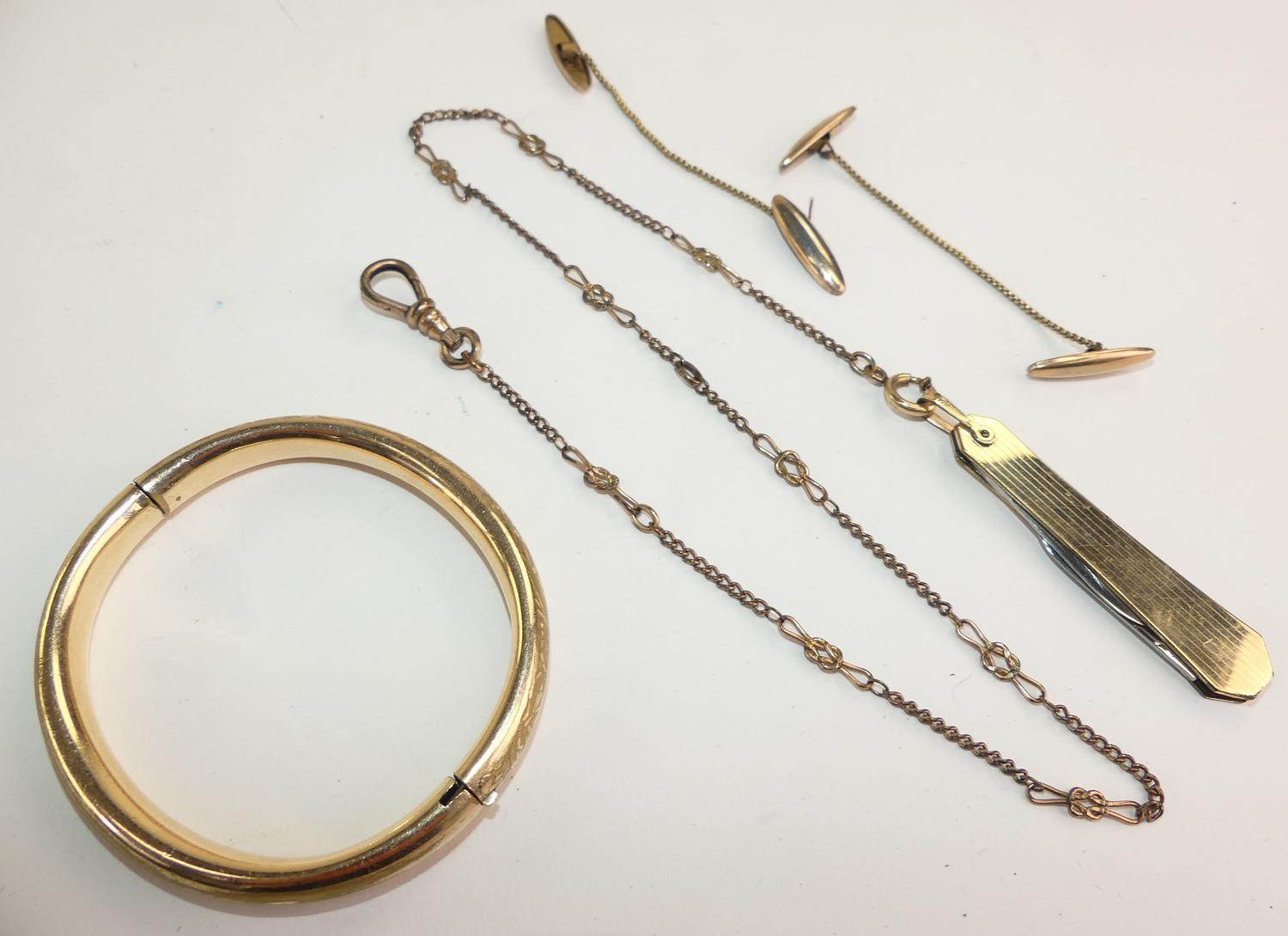 victorian gold filled bangle, pen knife, watch chain and chain cufflinks, circa 1900s