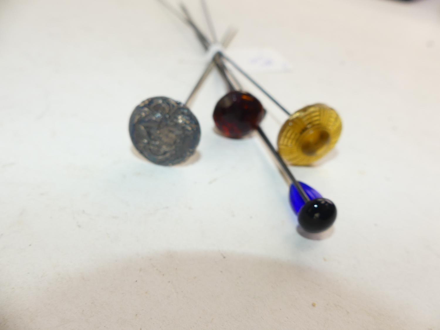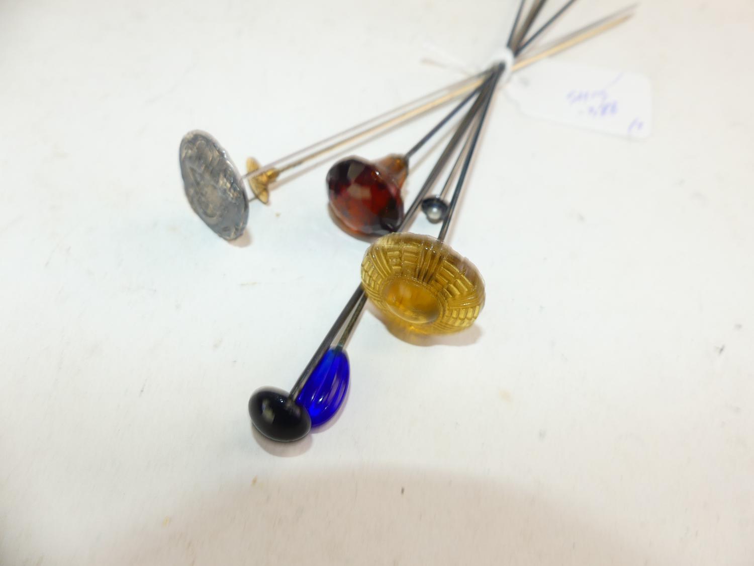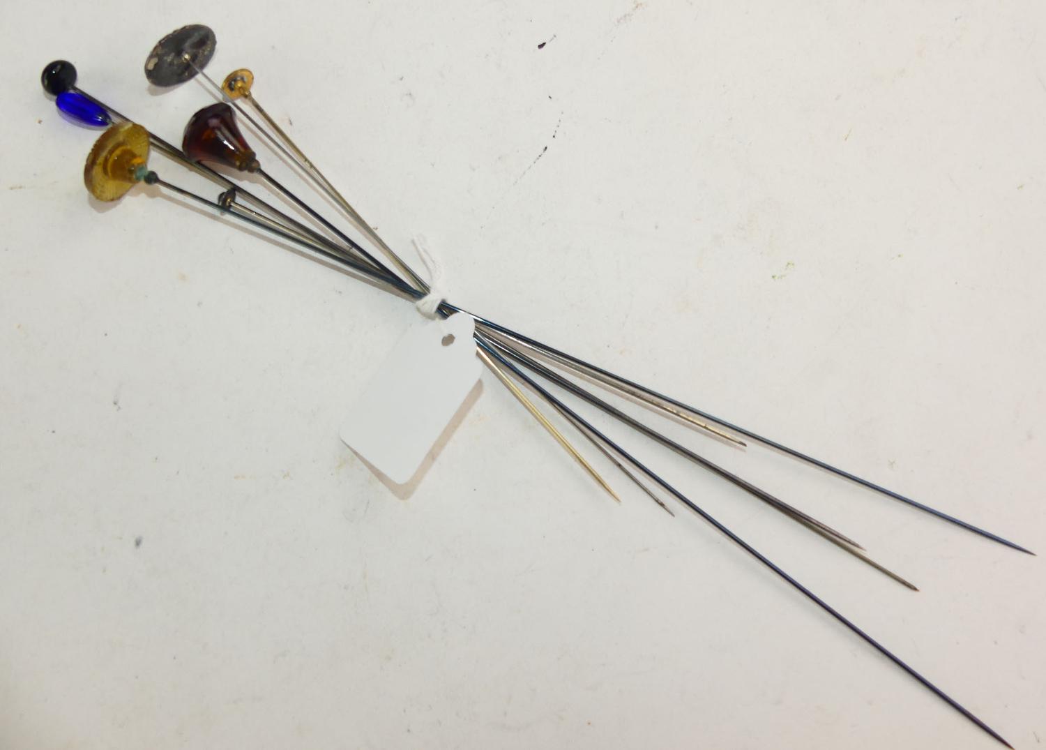7 vintage hatpins indluing art nouveau and art deco glass, 10 1/2" and smaller