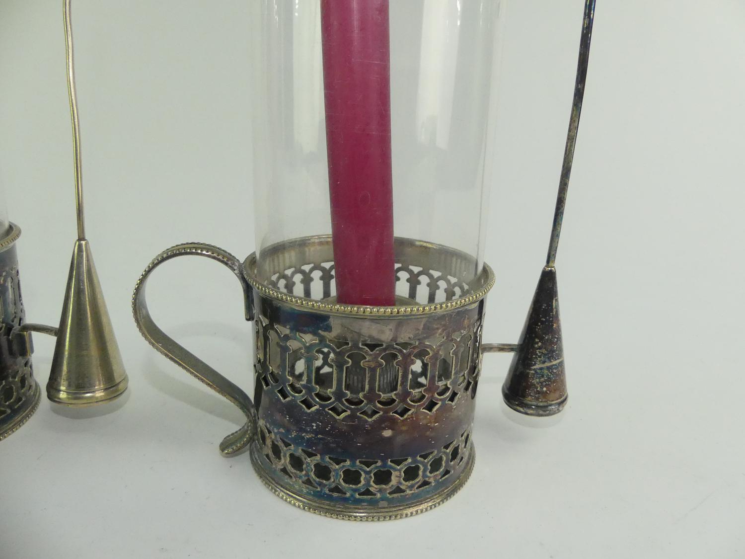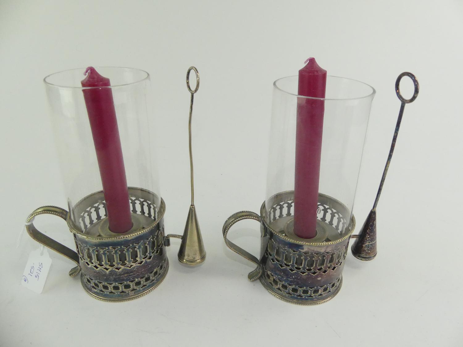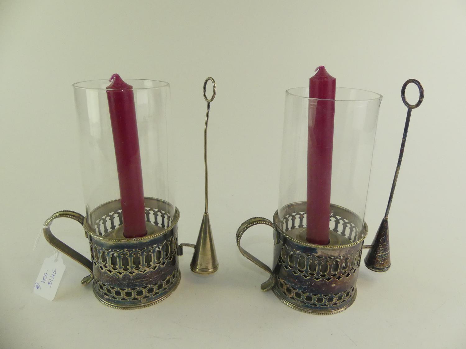 pair of silver plate chamber sticks with glass shades, ht. 8"