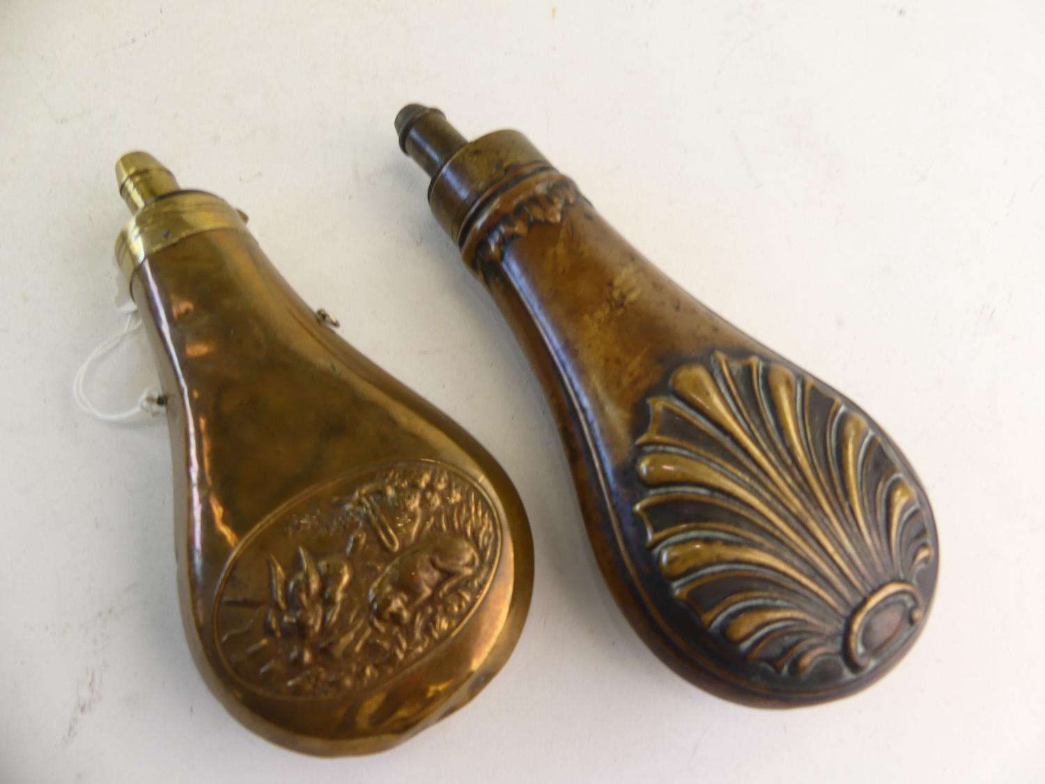2 antique brass powder horns