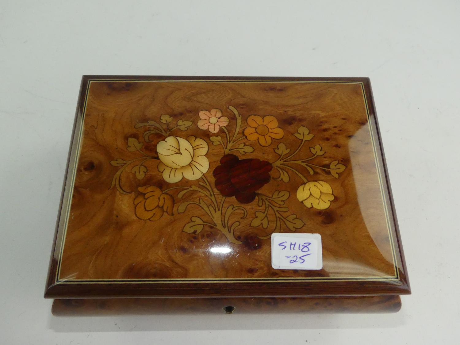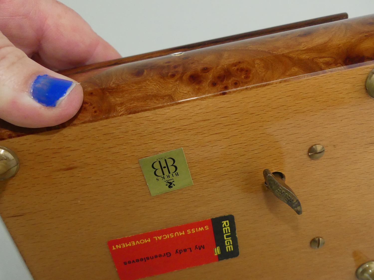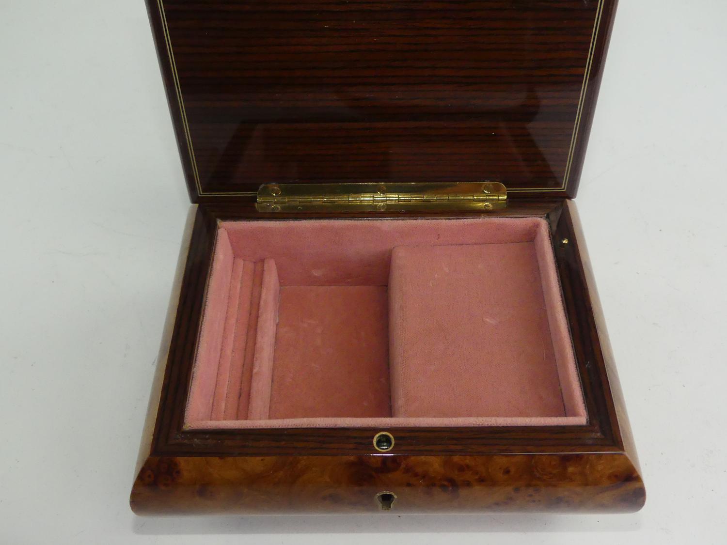 exotic wood musical jewelry box retailed by birks, 3" x 6 1/2" x 5"