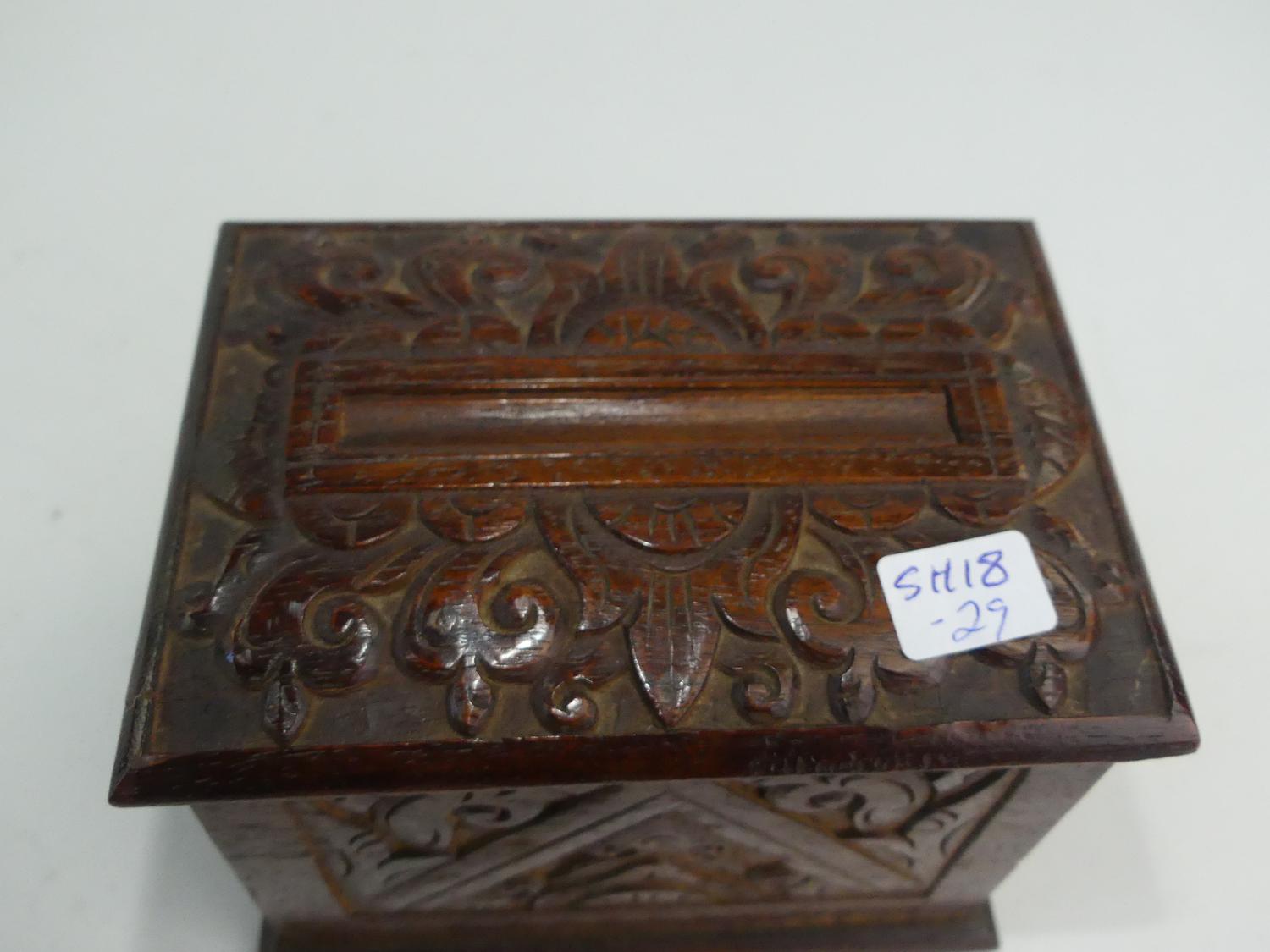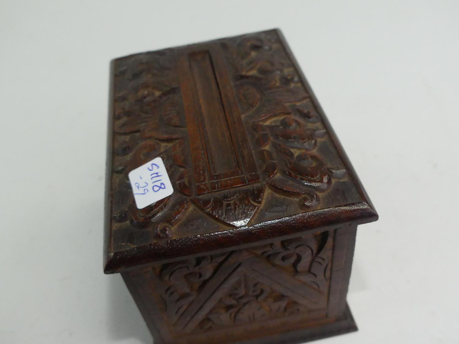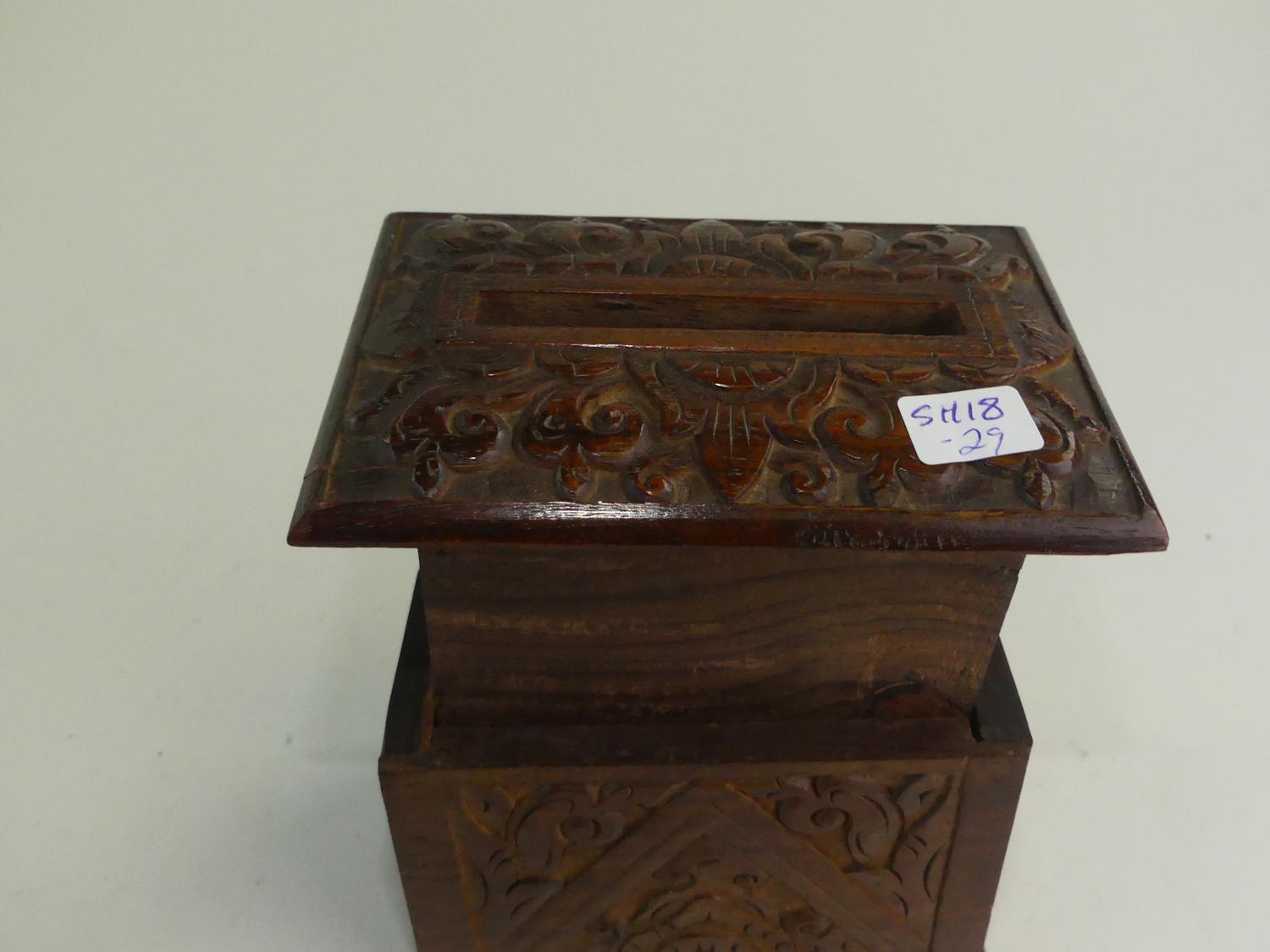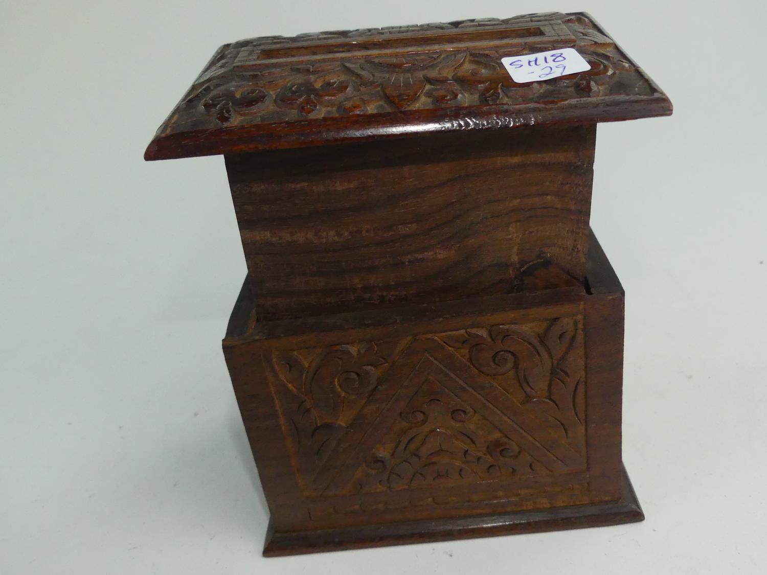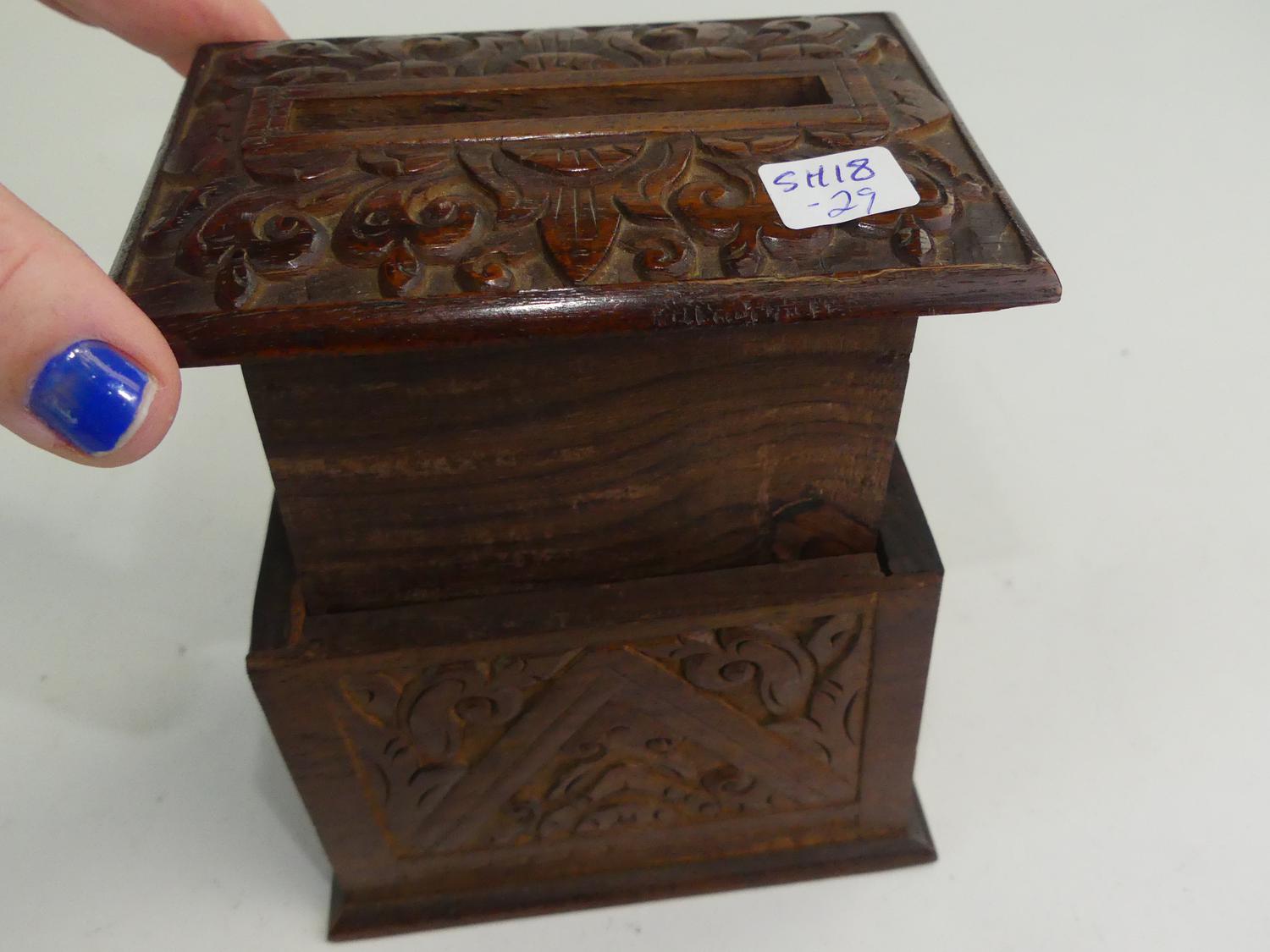 carved wood cigarette dispenser, 5" x 3 1/2" x 3 3/4"