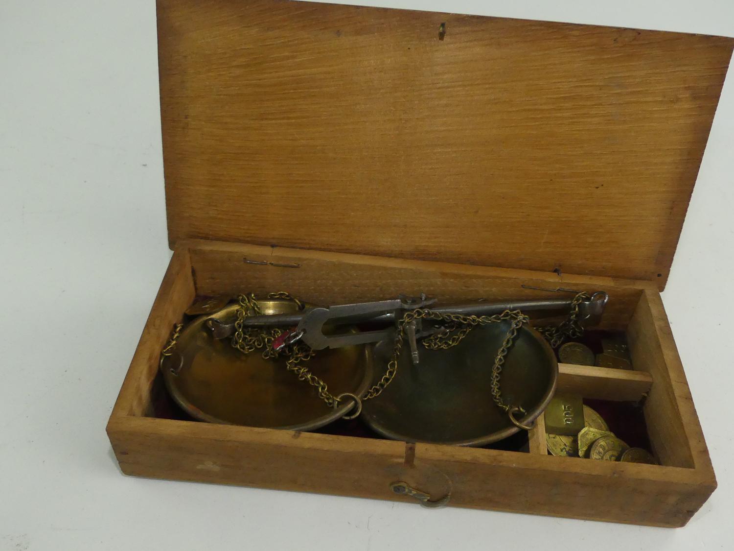 antique cased balance scale and weights, length 8 1/4"