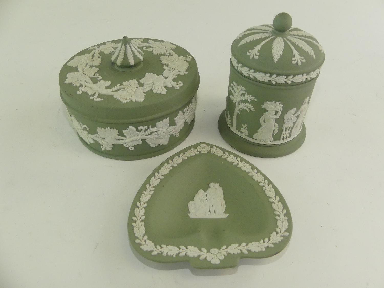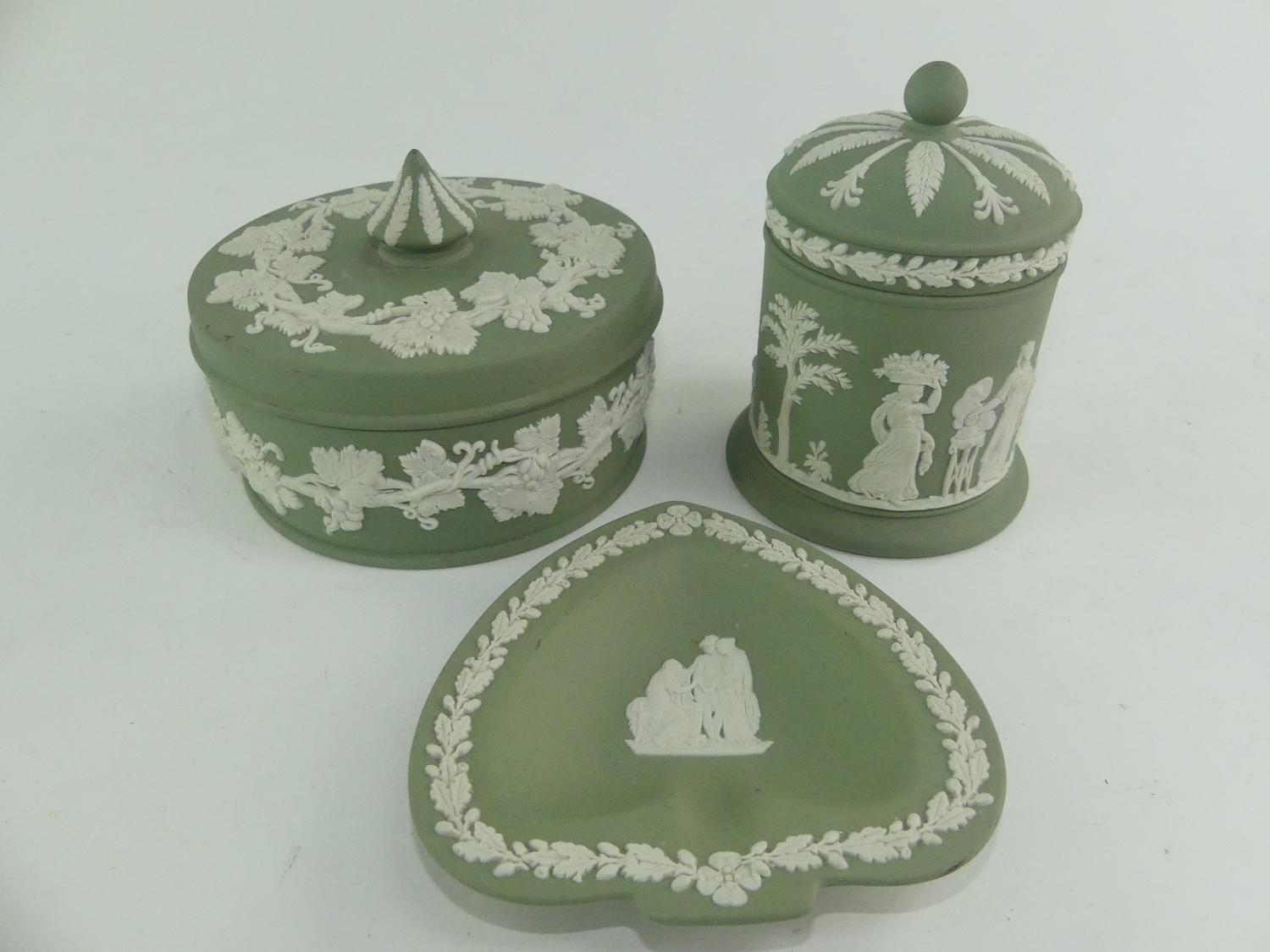 three pieces of wedgewood green jasperware
