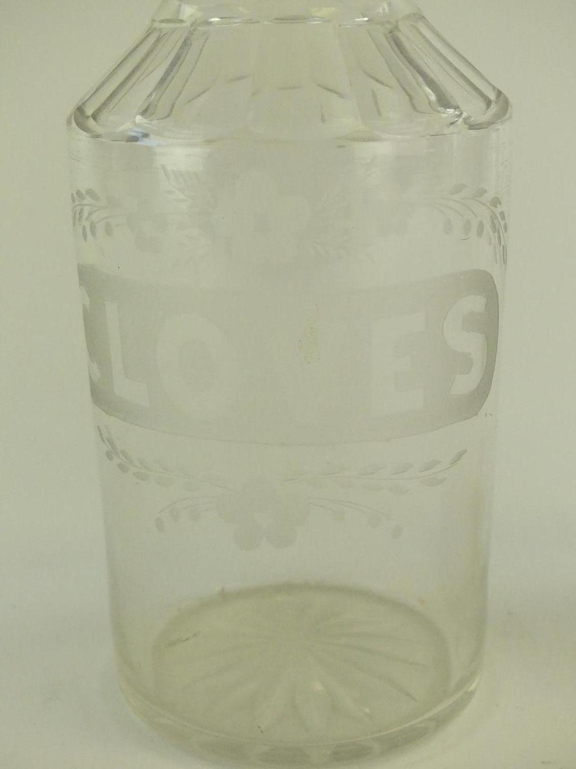 pair of antique etched glass decanters "cloves" & "spruce", ht. 11"