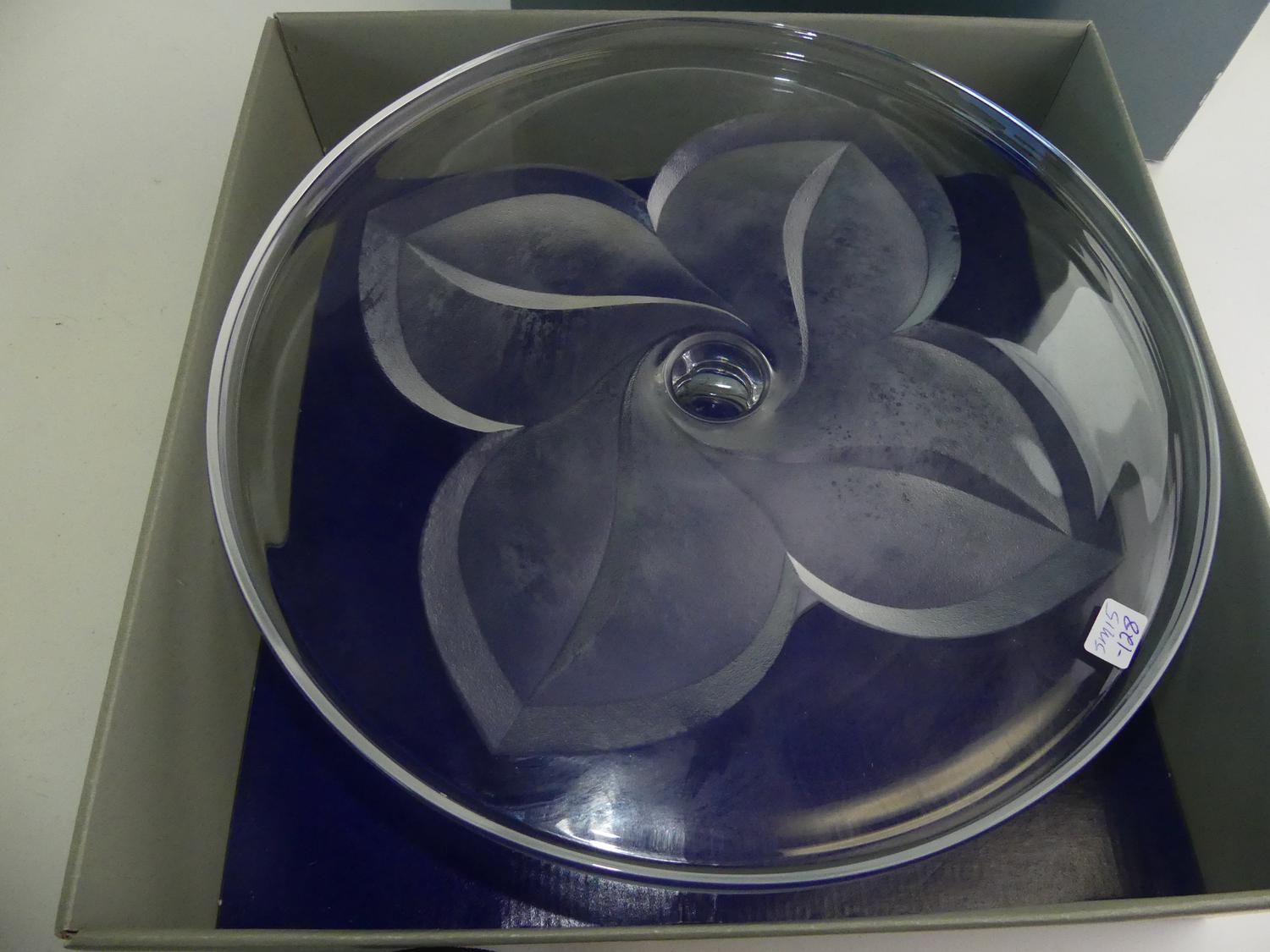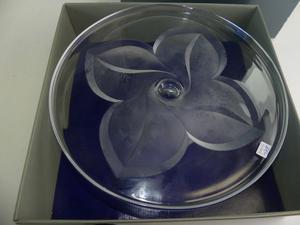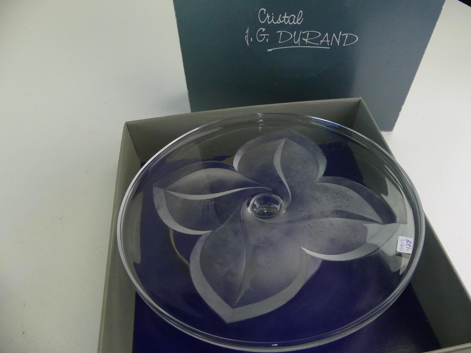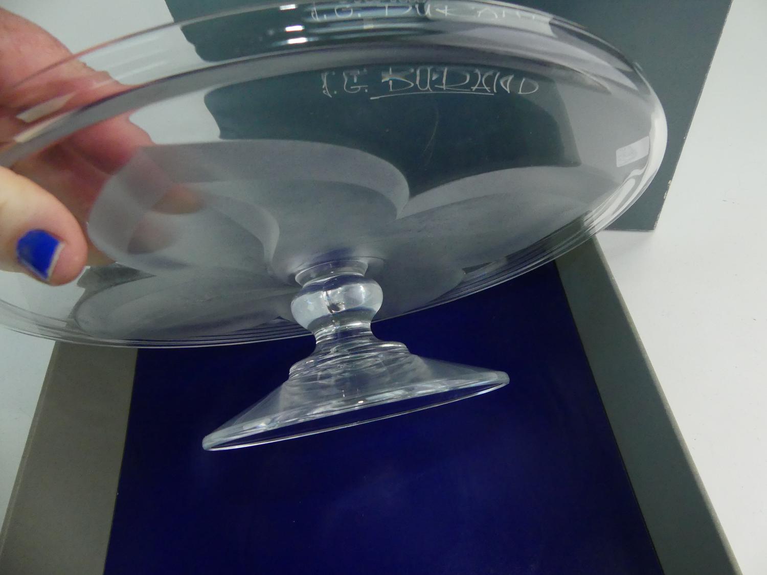 j.g. durand etched crystal pedestal cake stand in original box, 3 1/2" x 12"
