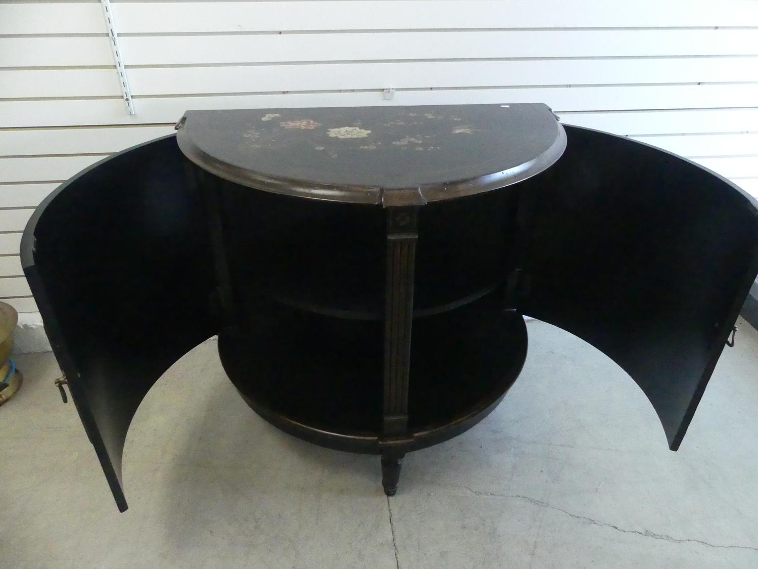 chinoiserie decorated demi-lune side cabinet, 32" x 35" x 20"