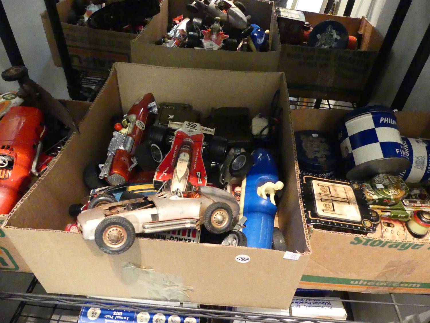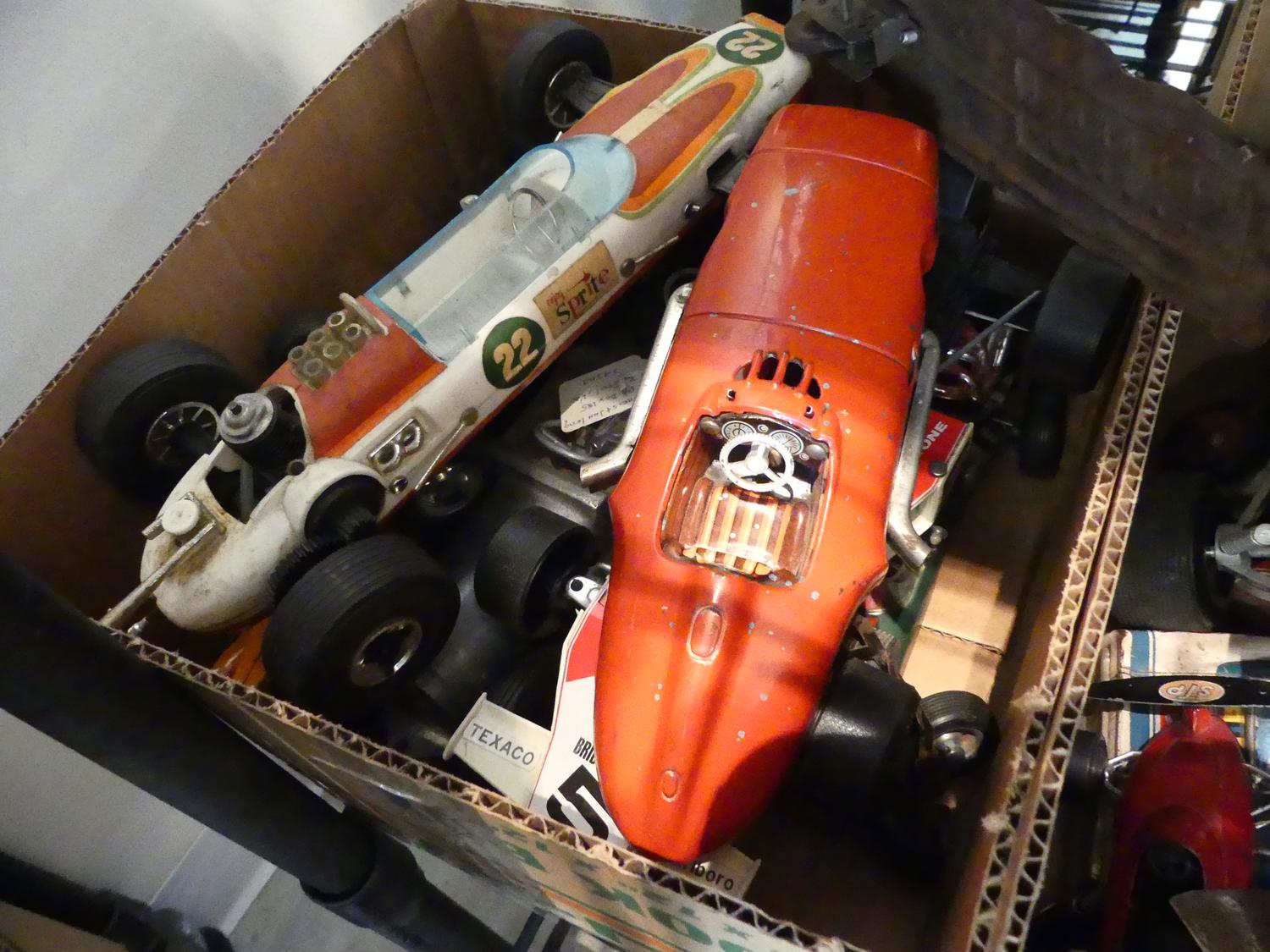 lot of toy race cars and other vintage toys