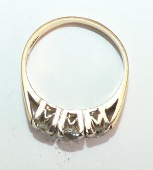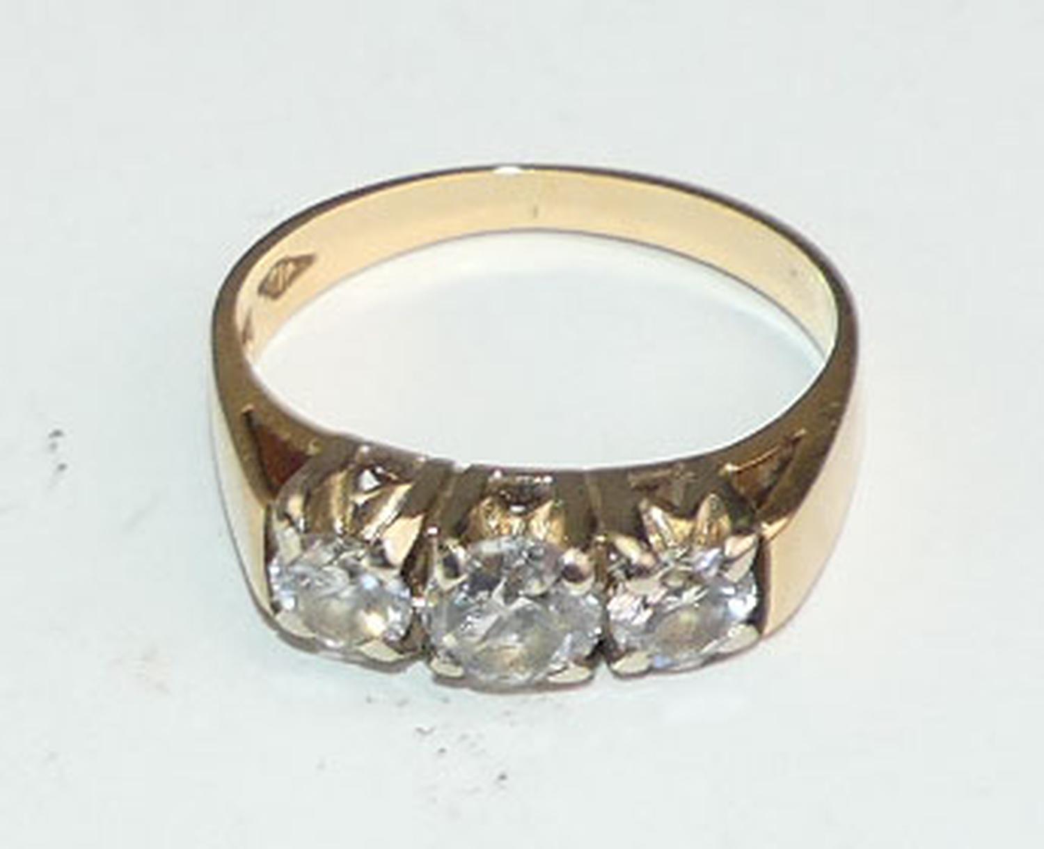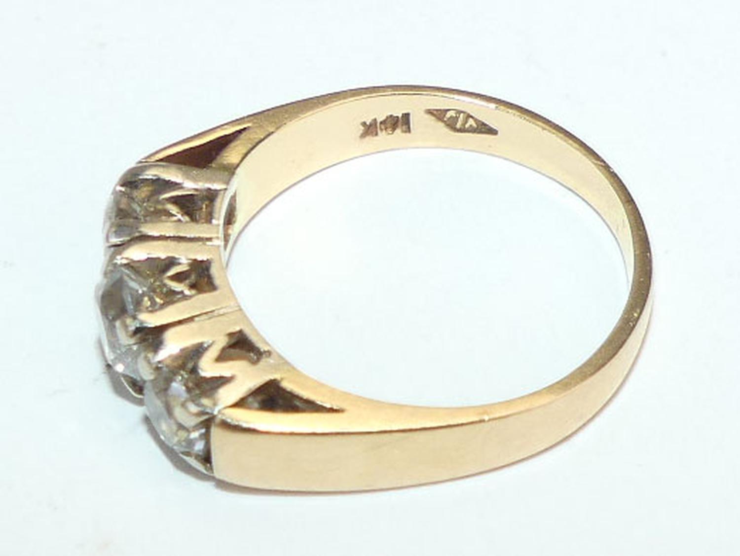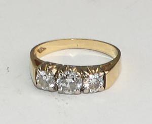 10k yellow gold three diamond ring, size 5 3/4, approx .85 cts
