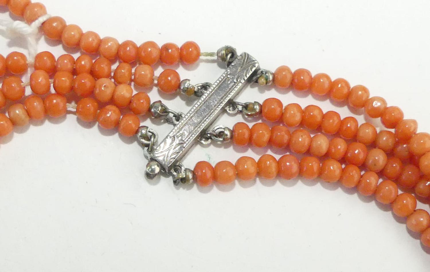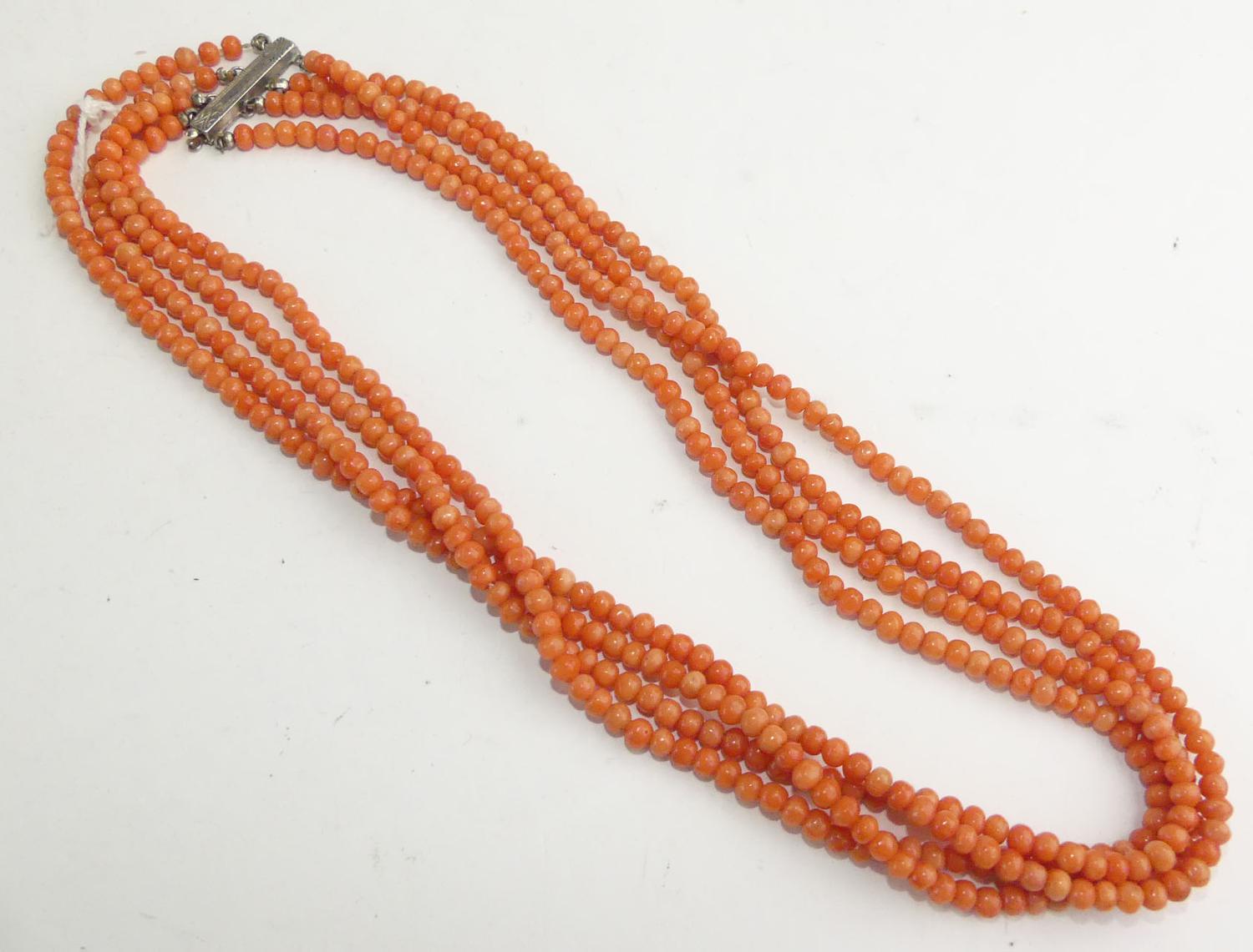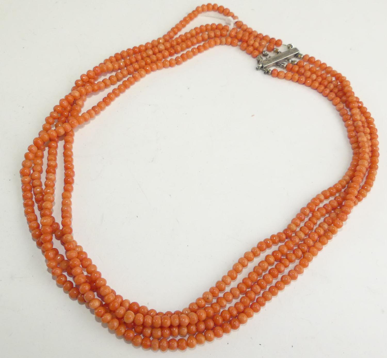 antique four strand coral necklace, length 15"