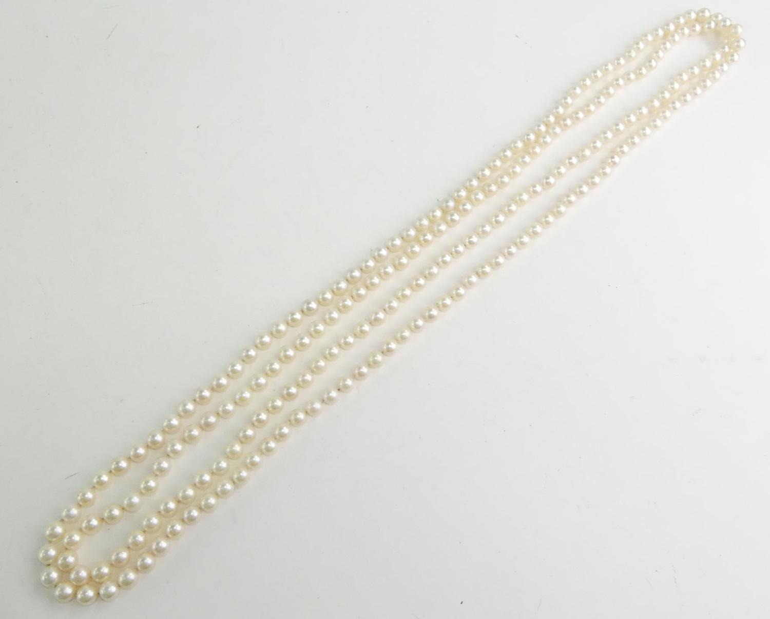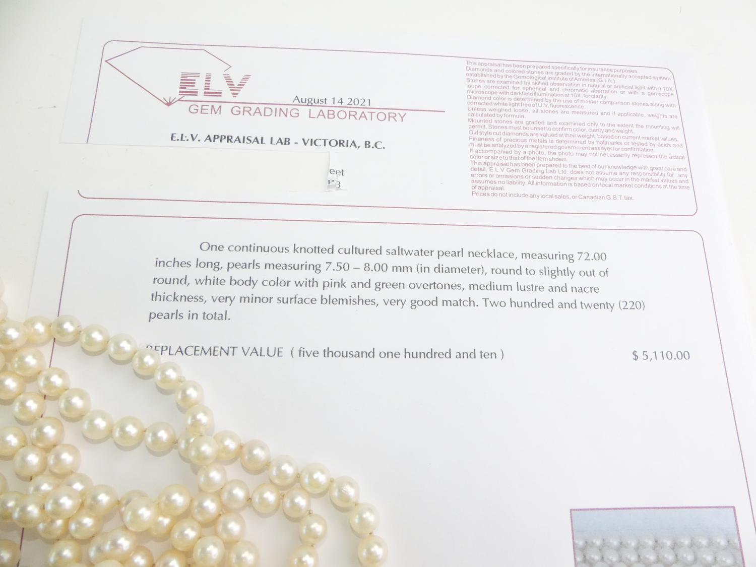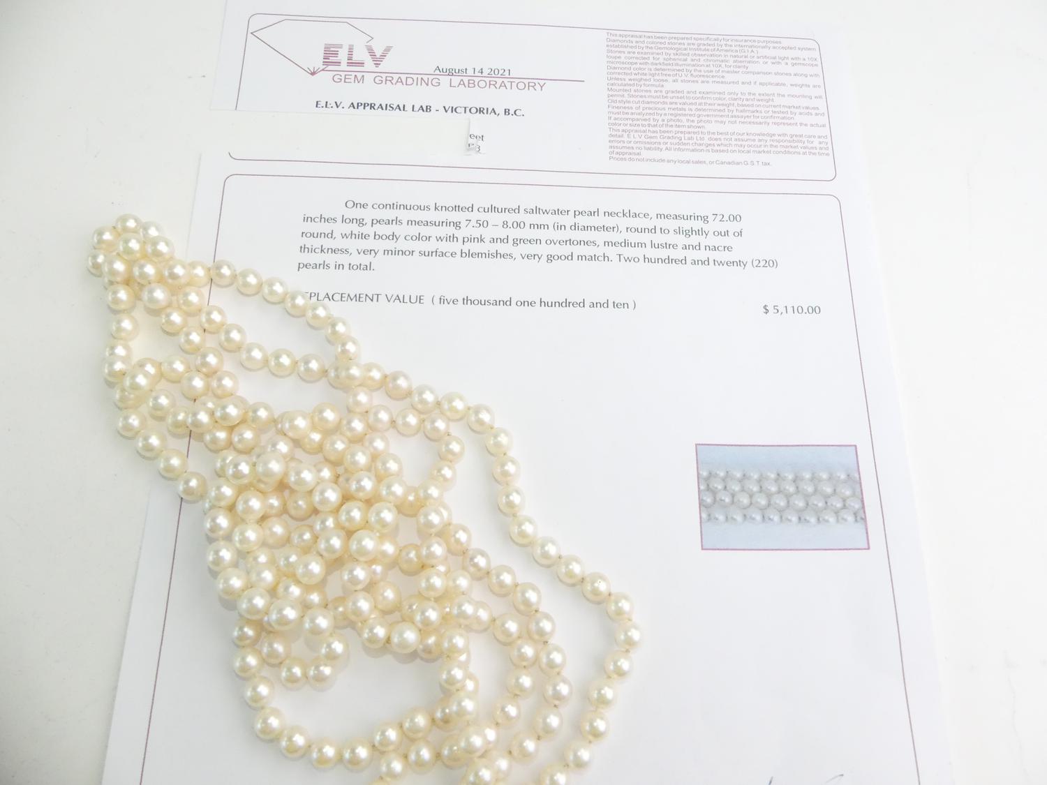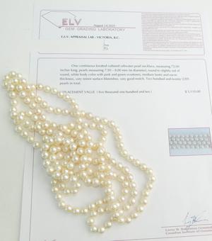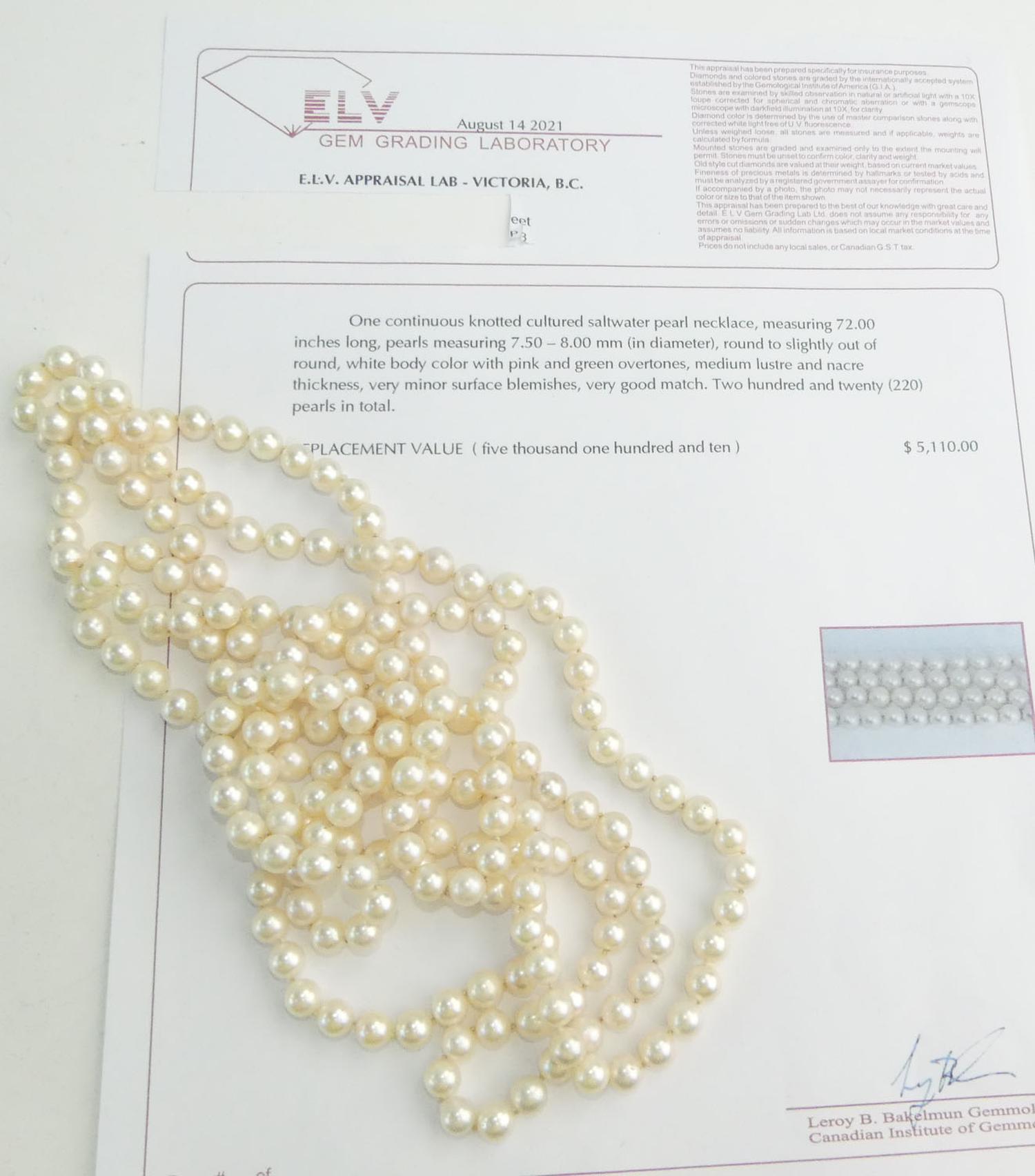 cultured pearl necklace, 72", 7.5-8.00mm, with appraisal