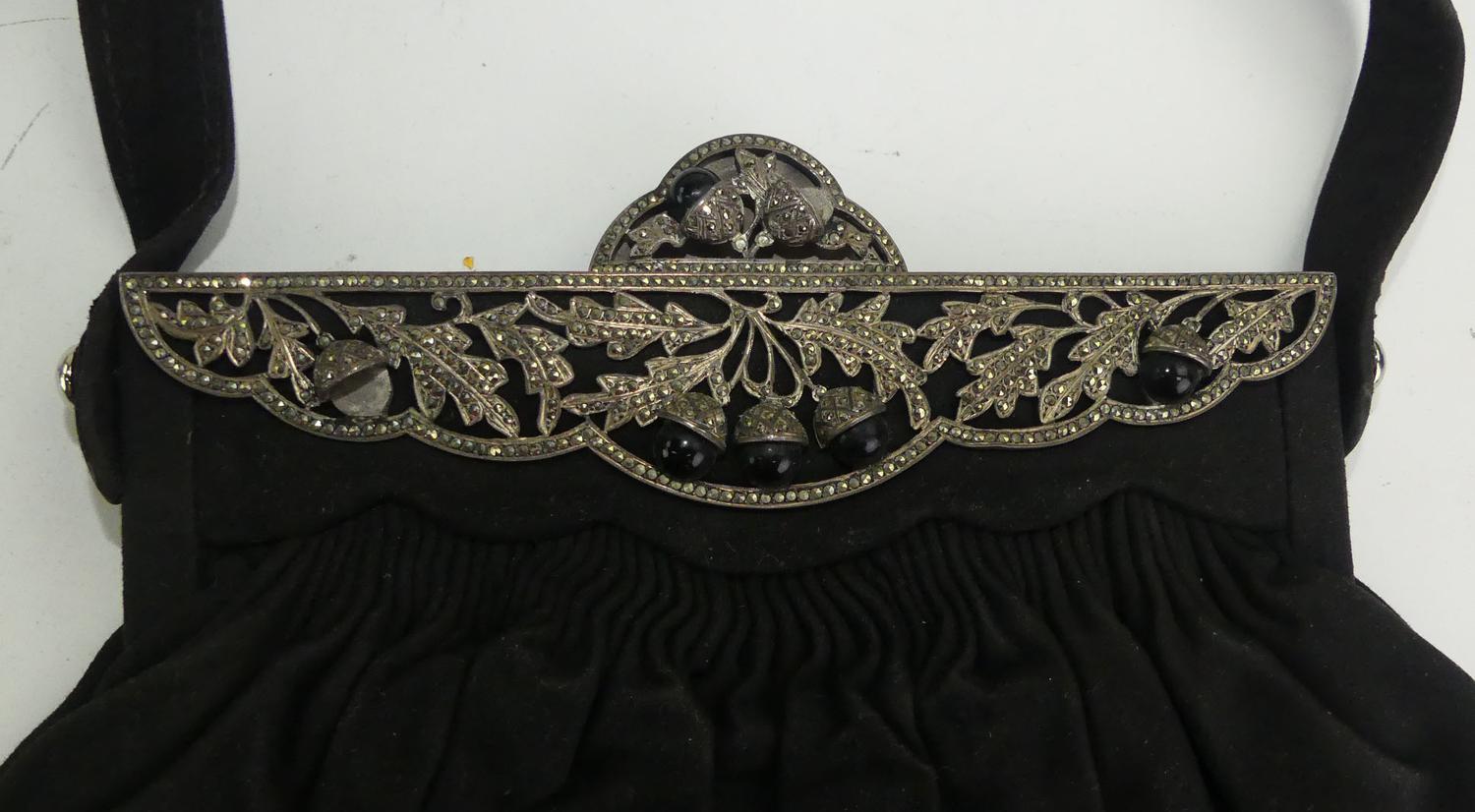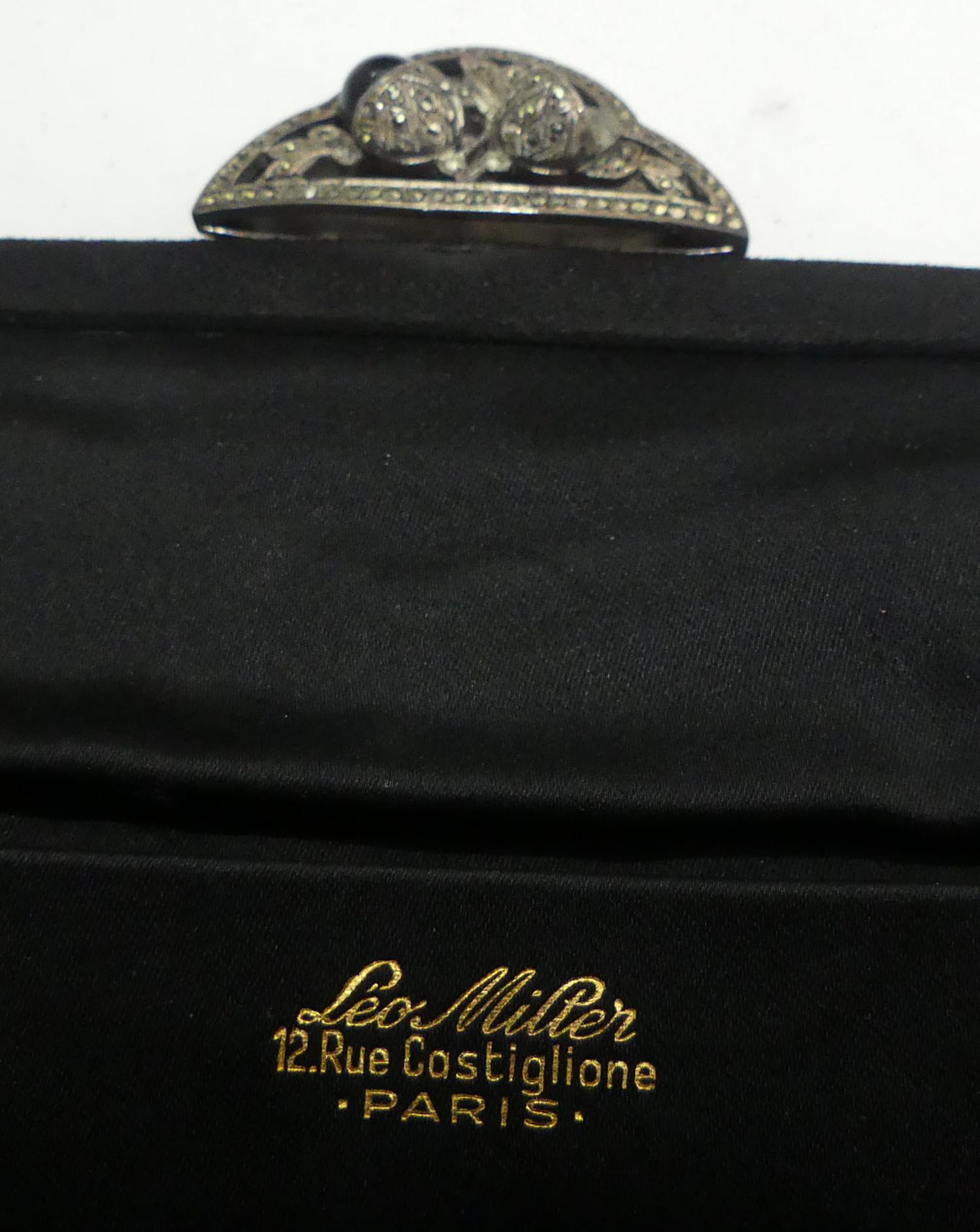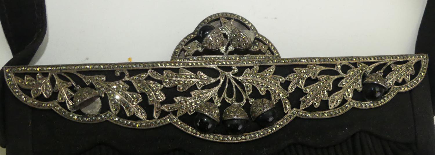 art deco french hallmarked silver marcasite frame evening purse, leo milter, paris, 9" x 7"