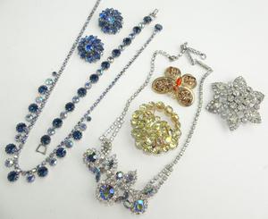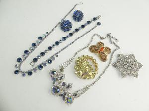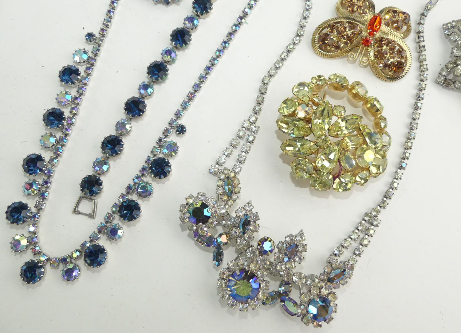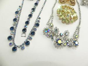 vintage weiss rhinestone parure, 3 brooches and jay flex sterling rhinestone collar necklace