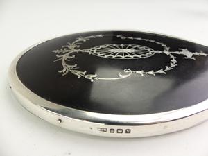a fine george v sterling silver inlaid tortoise shell hand mirror, walker & hall, birmingham 1920, length 11 1/2"