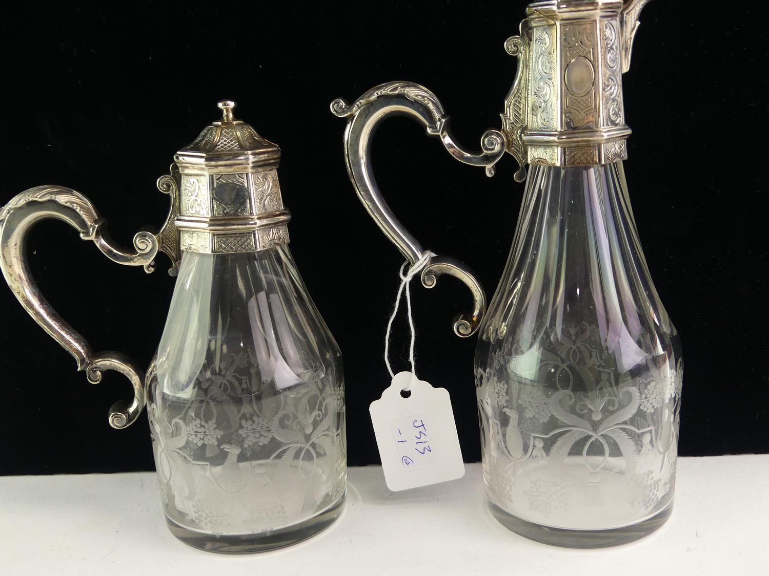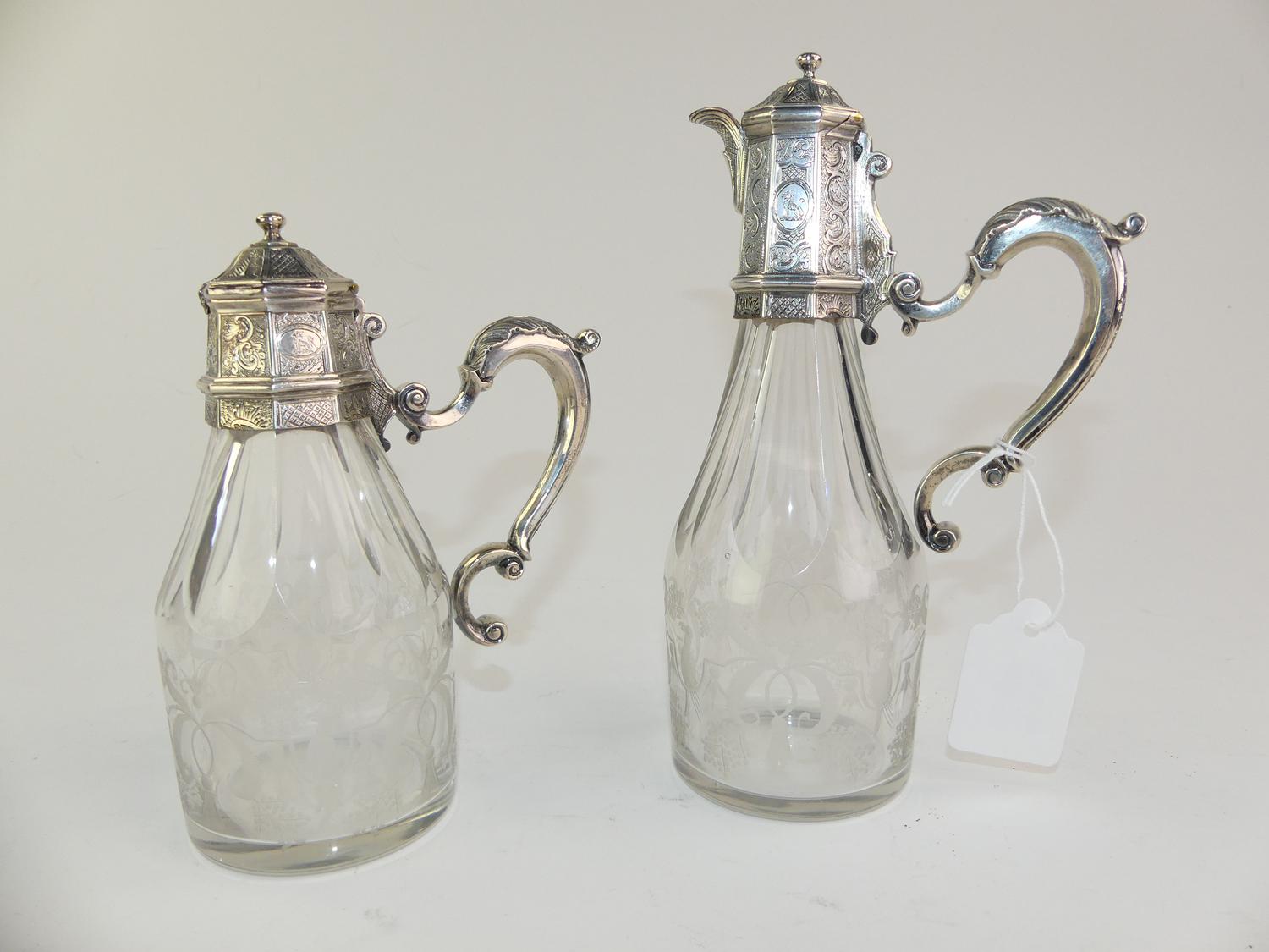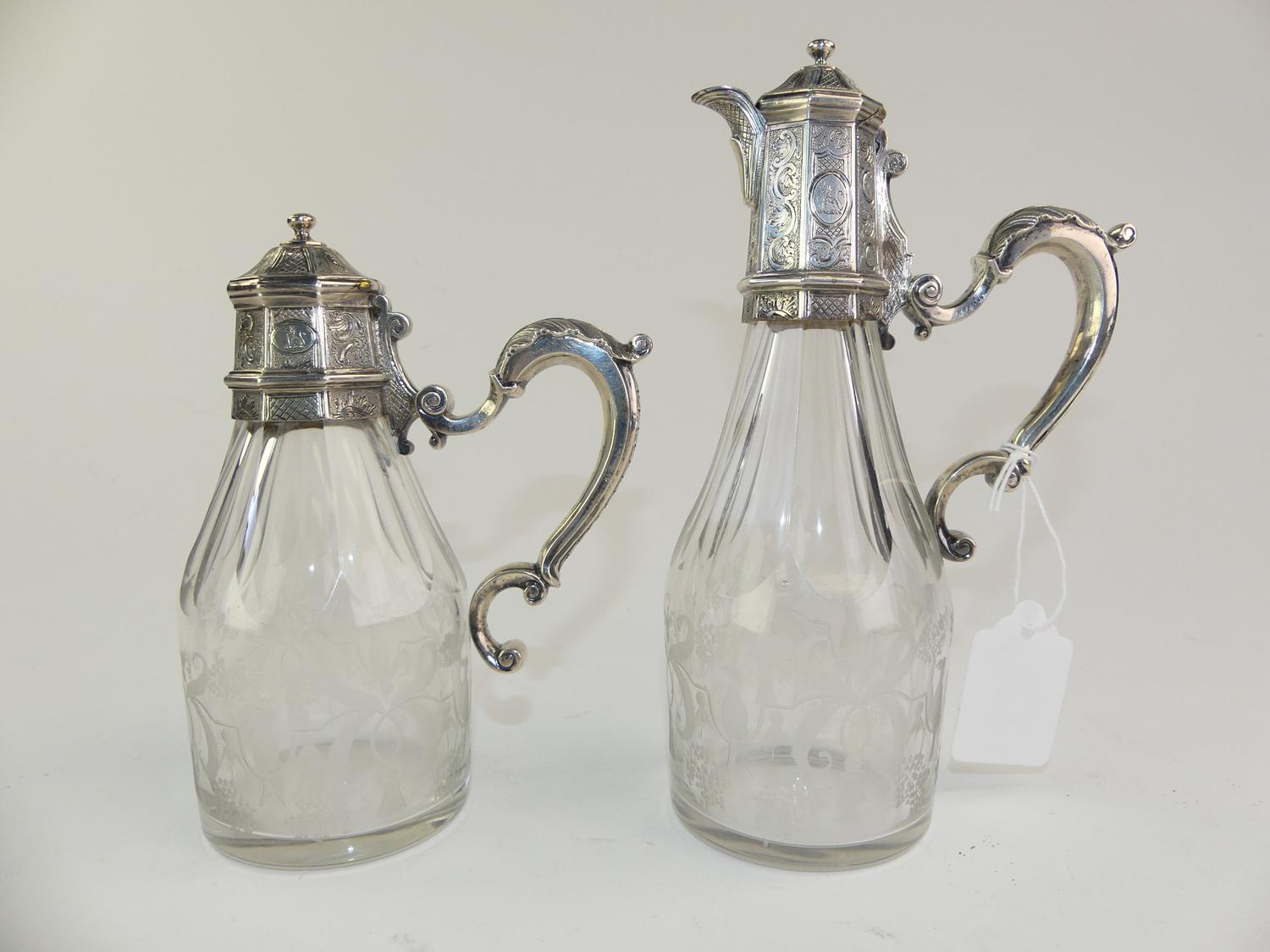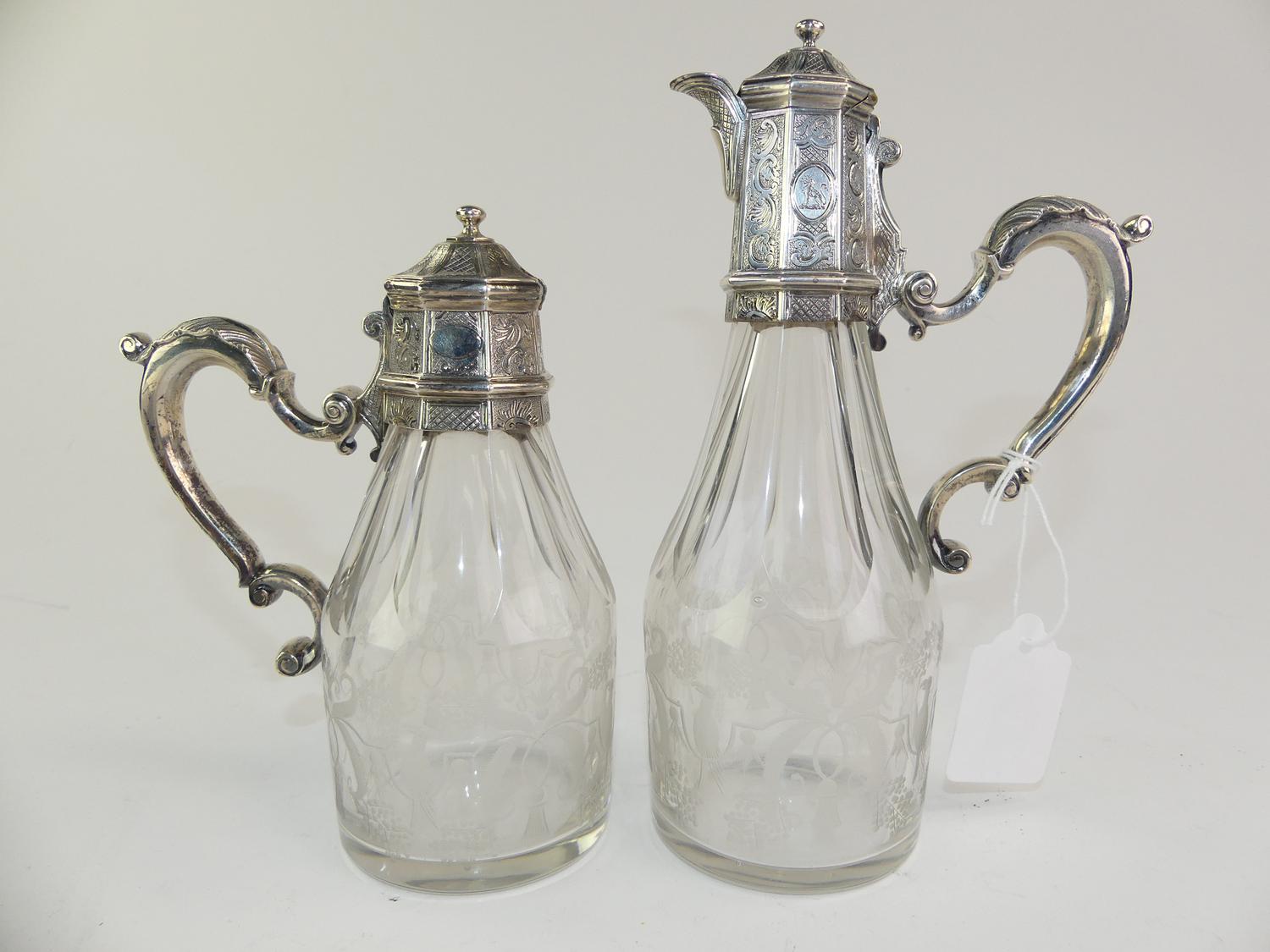 pair of william iv irish sterling silver and etched glass bottles, henry flavelle, dublin 1836, ht. 7 1/2" and 6"