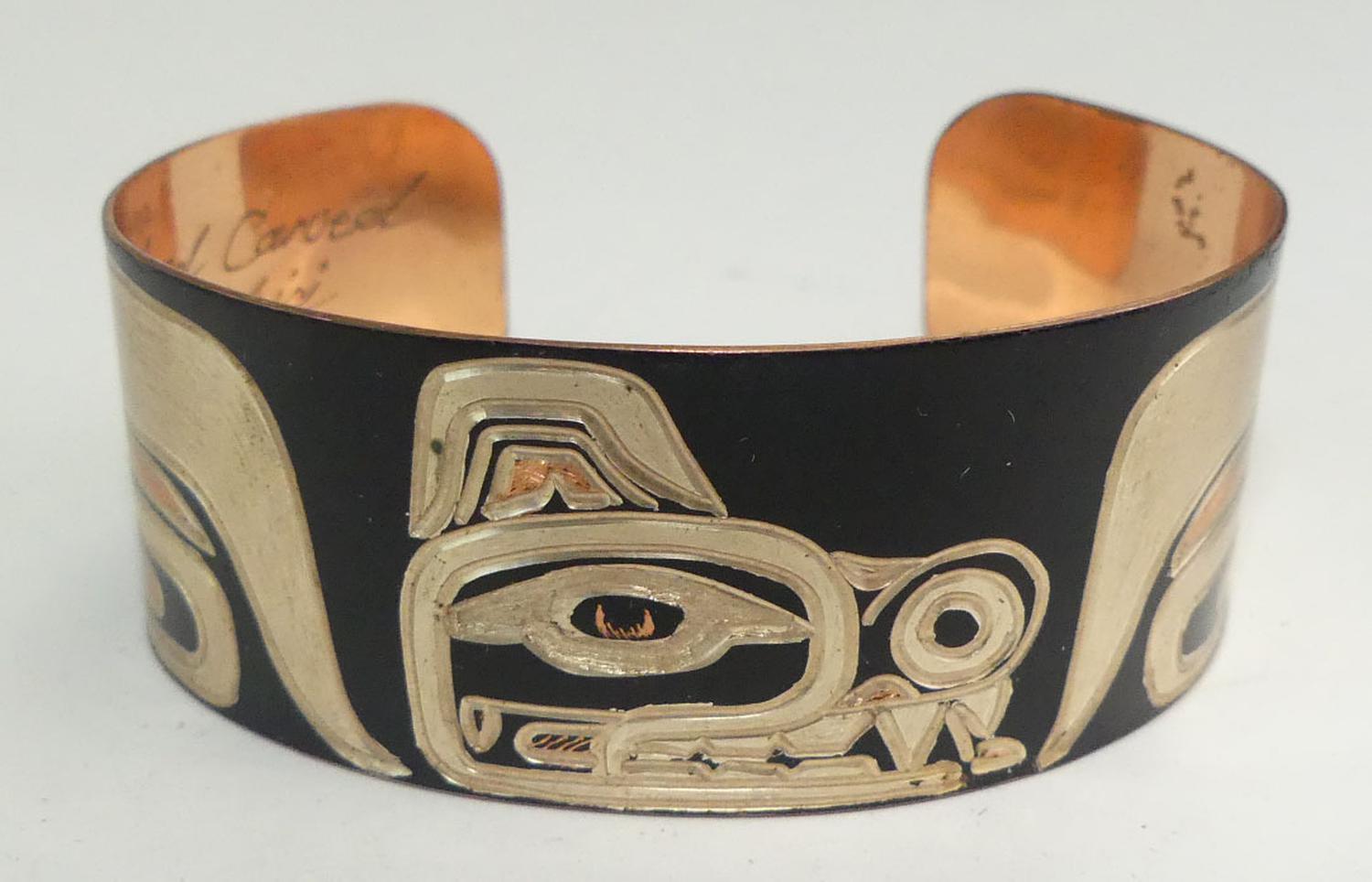 native mixed metal cuff bracelet signed "hand carved, m. elgini, bear, vancouver bc", width 1"