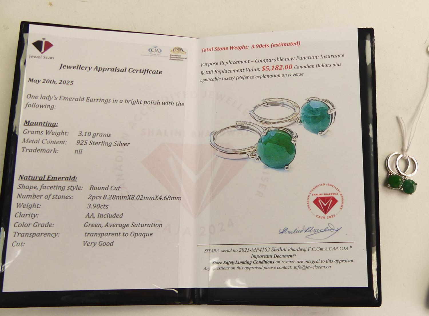 sterling silver emerald earrings, 3.9cts, with appraisal