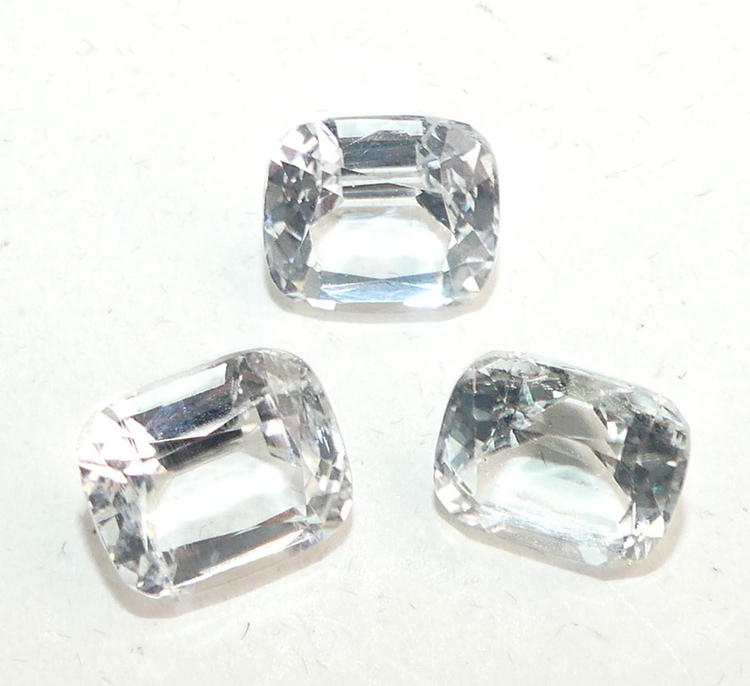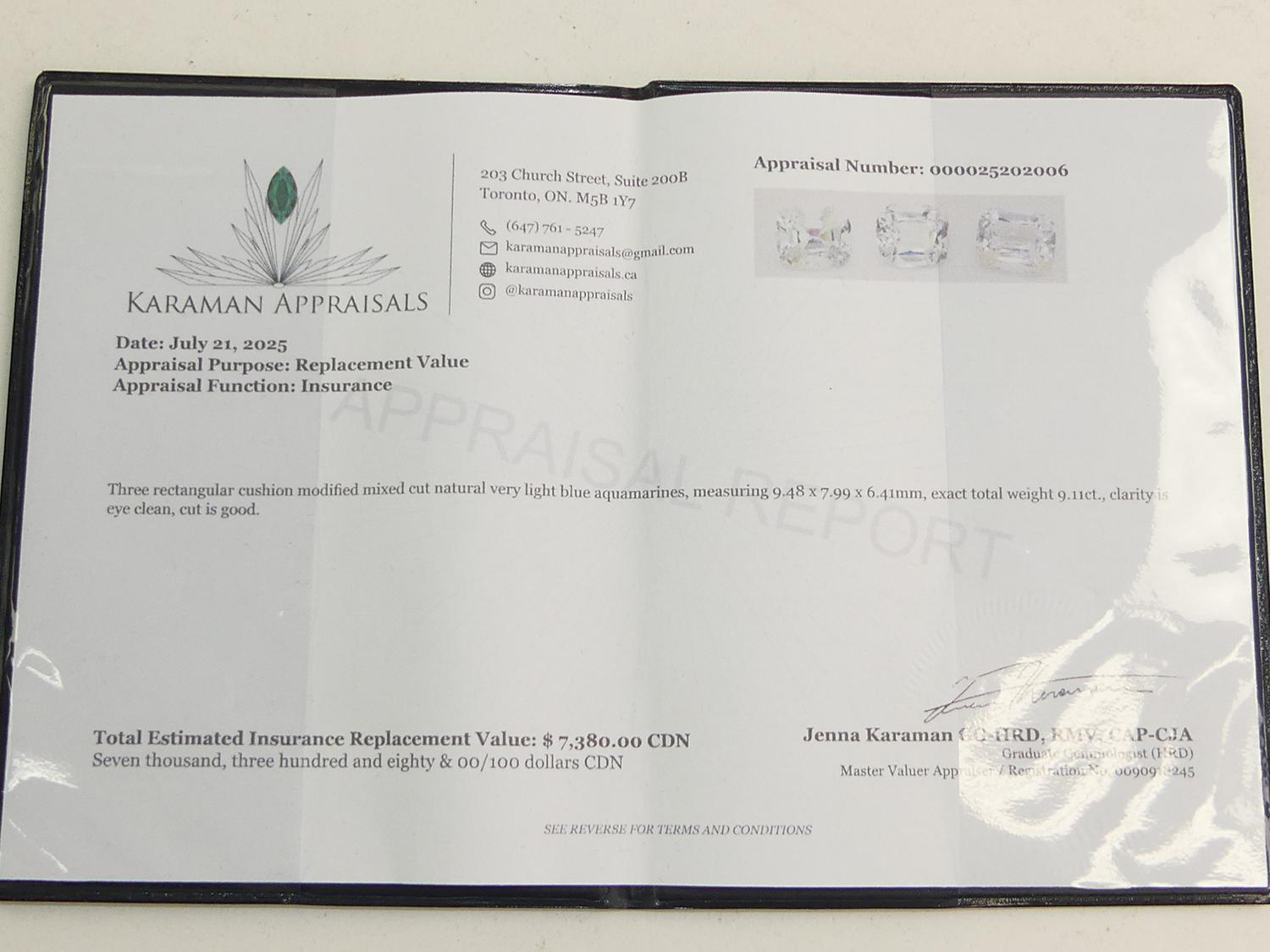 3 unmounted aquamarines, 9.11cts, with appraisal