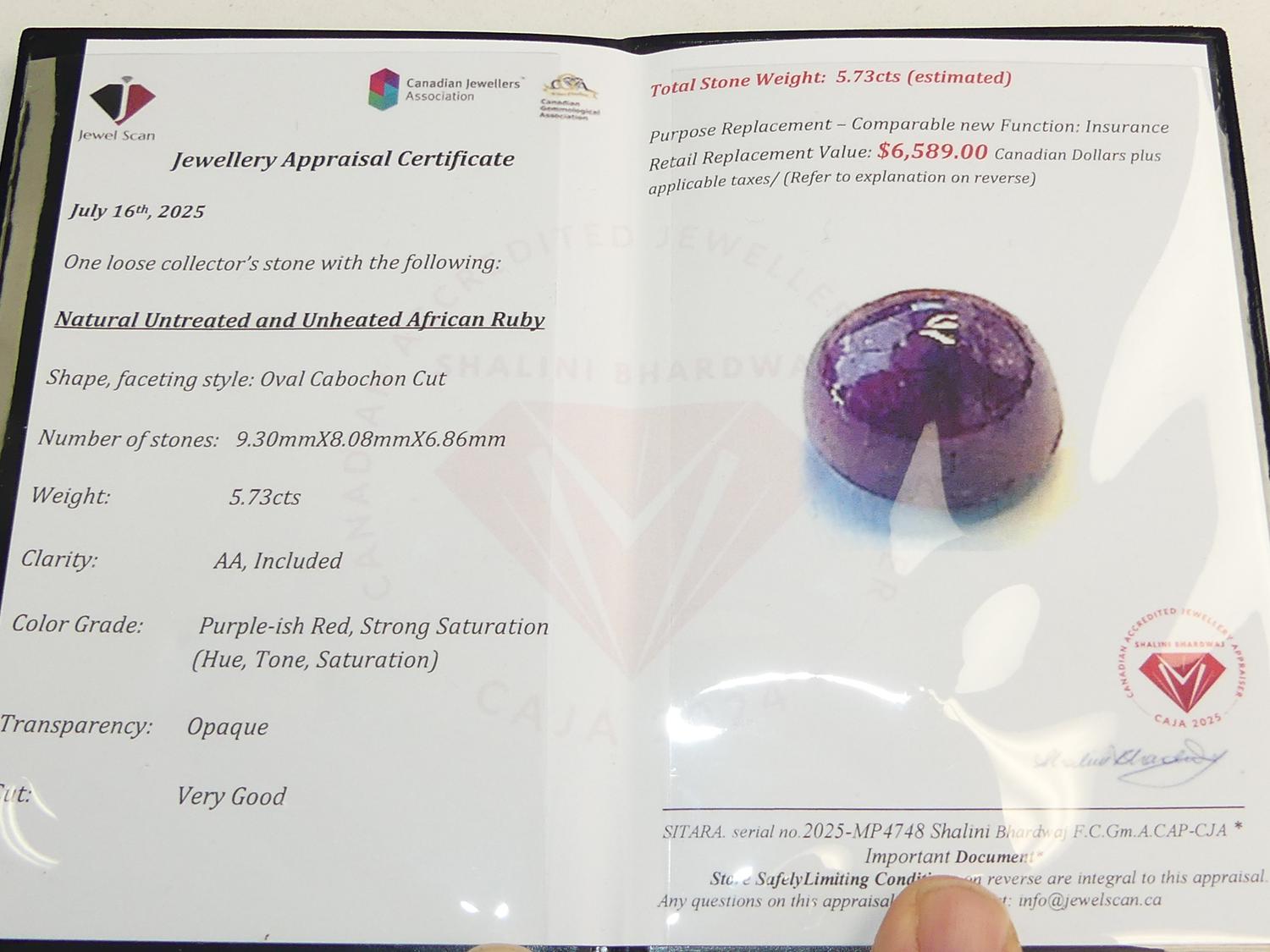 unmounted ruby cabochon, 5.73 cts, with appraisal