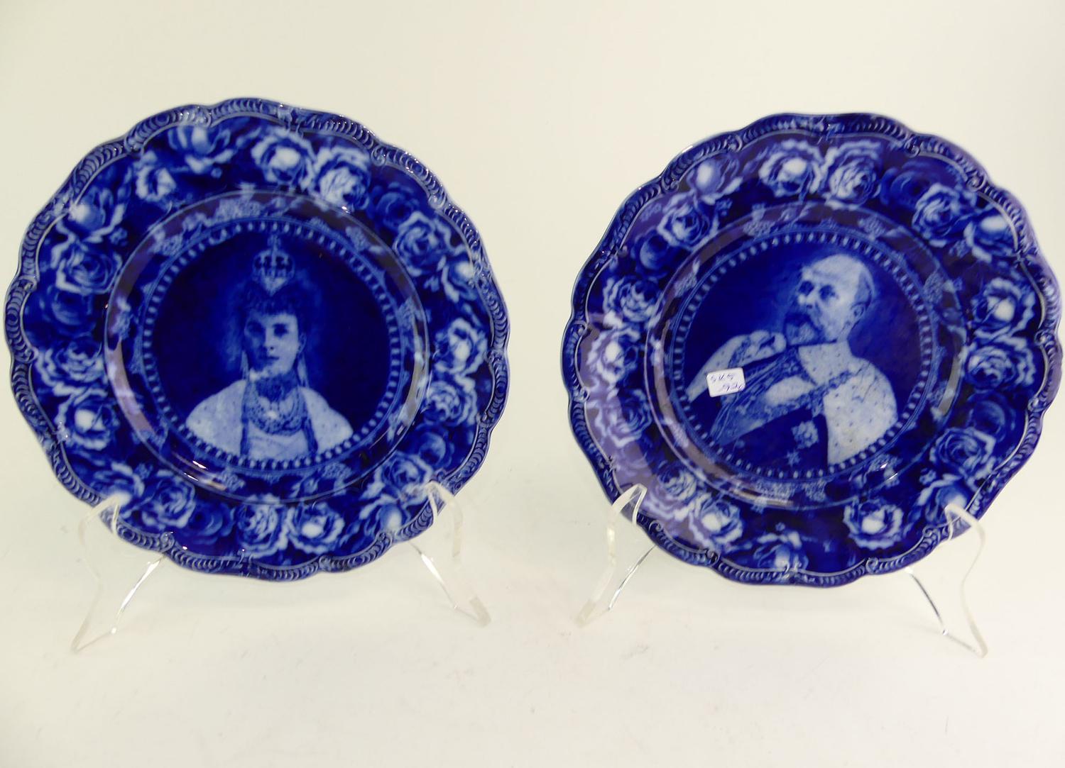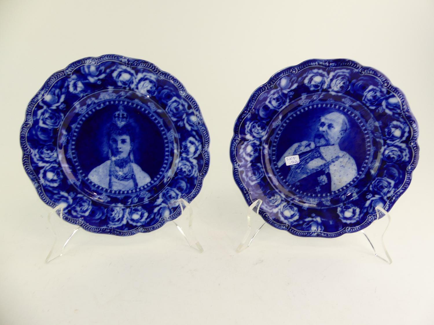 pair of english flow blue royal commemorative plates - edward vii & alexandria