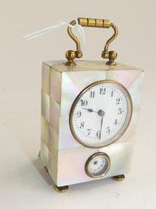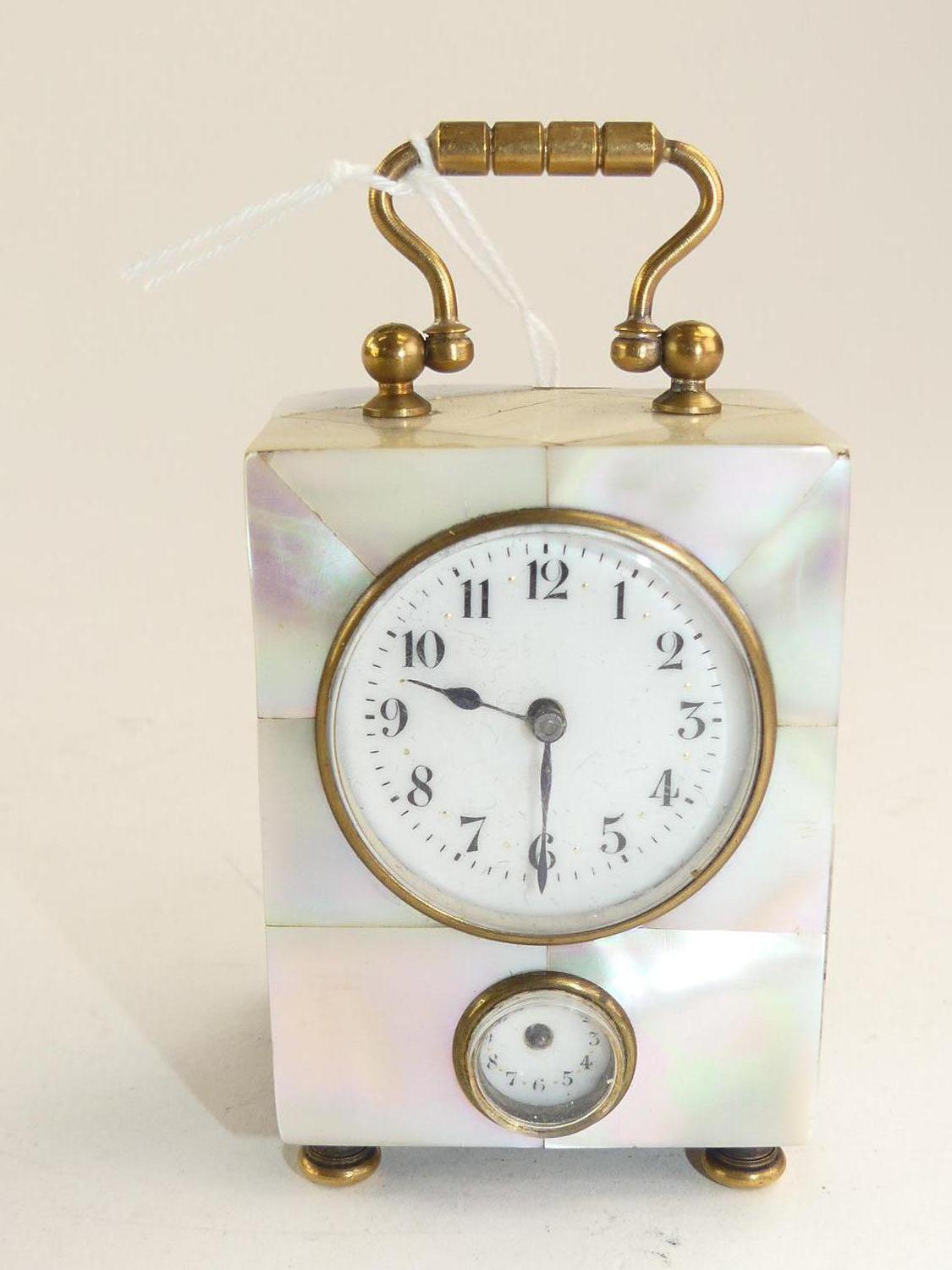 19th century mother-of-pearl and brass carriage clock, ht. 3 3/4"