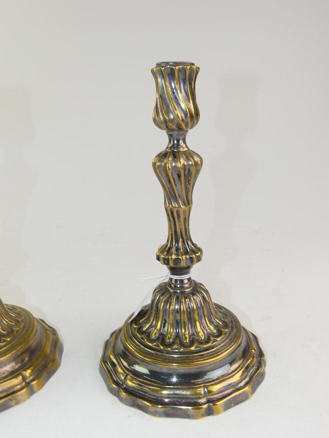pair of antique silver plate on brass candle sticks, showing fabulous wear!, ht. 10"