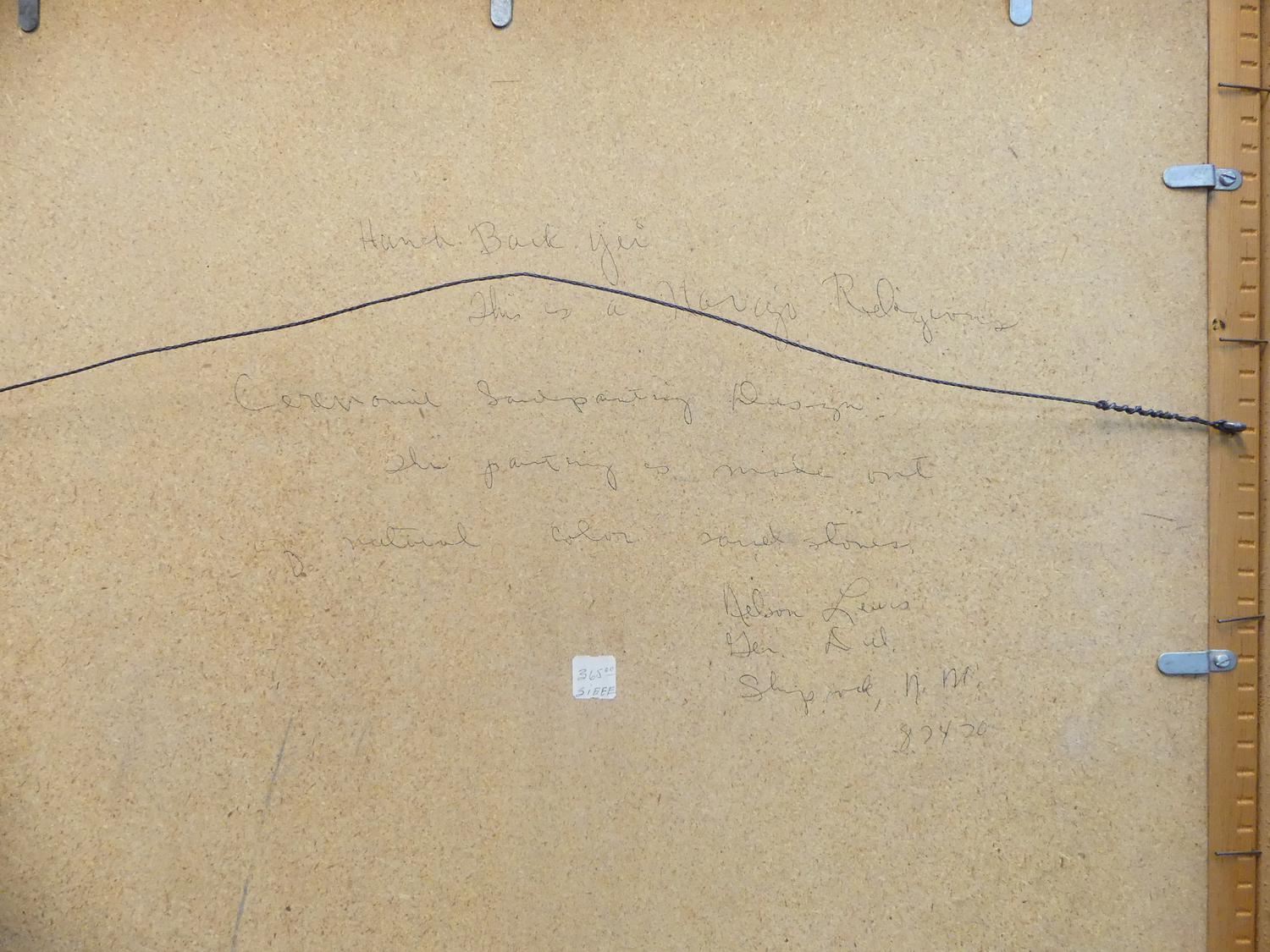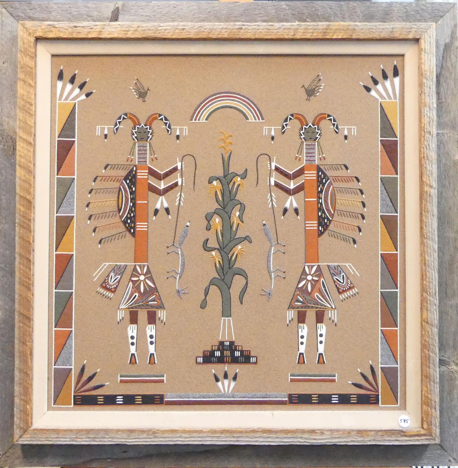 navajo sand painting by nelson lewis, 24" x 24", "hunch back yei"