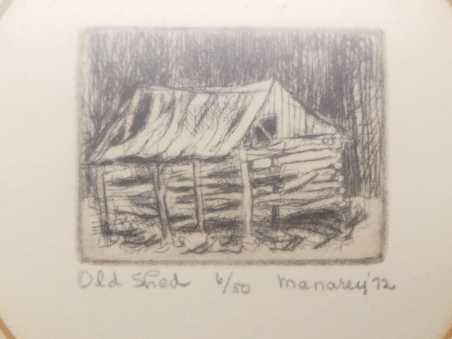 thelma alberta manarey (1913-1984), dated 1972, etching, 1 1/2" x 2", "old shed"