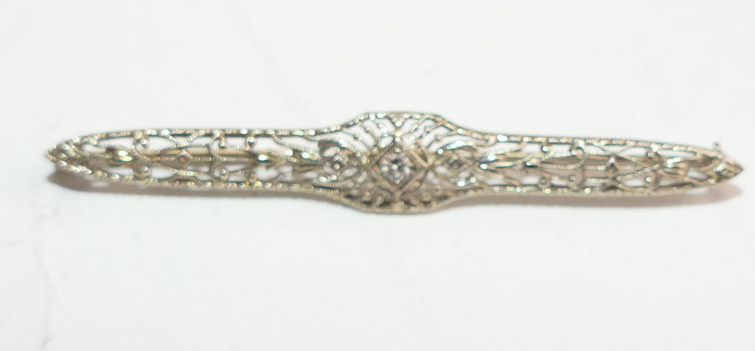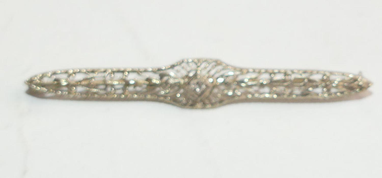 art deco 10k white gold filigree diamond pin, w/a 2.5 grams