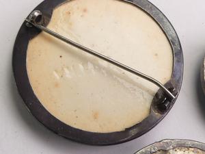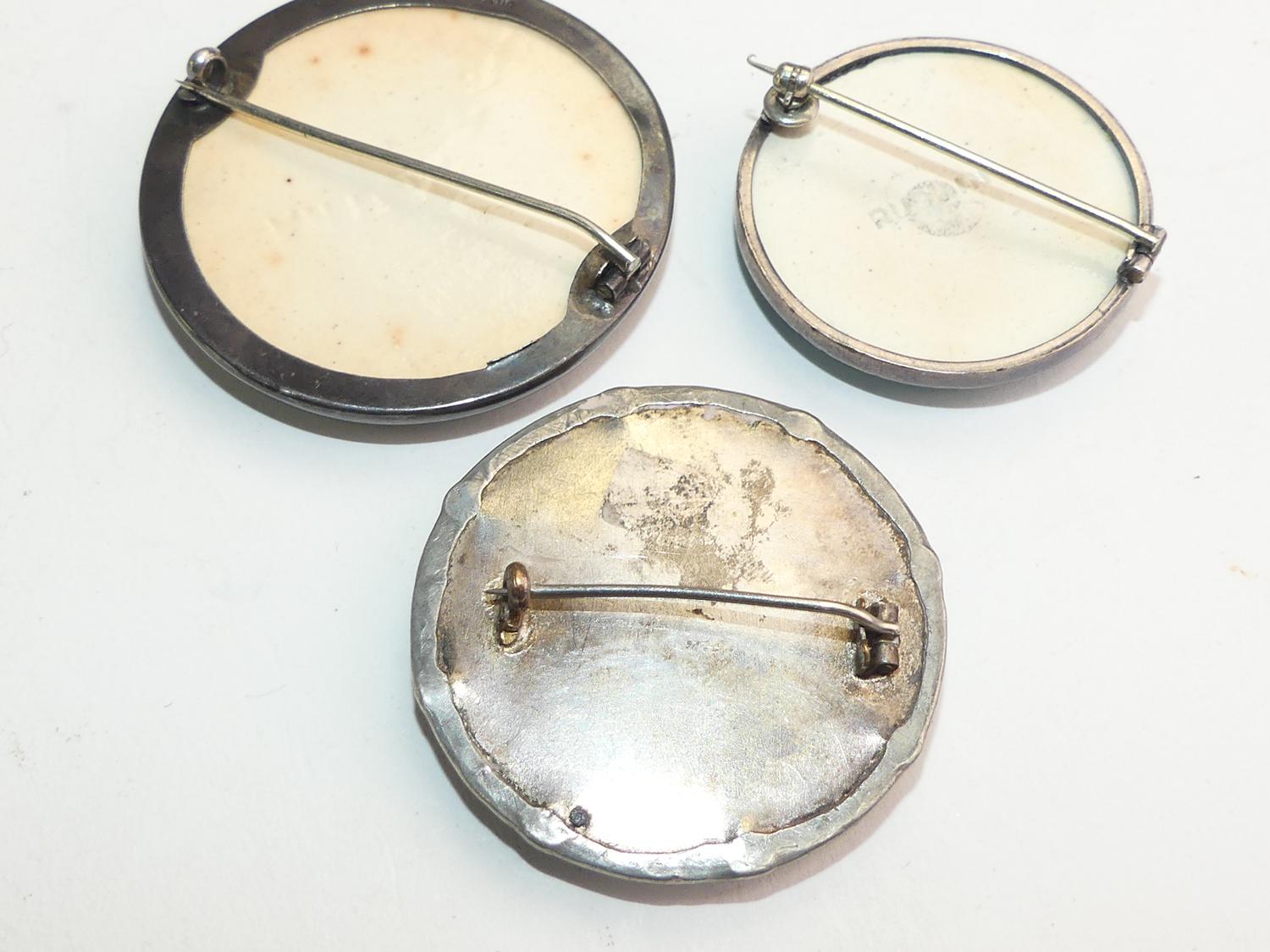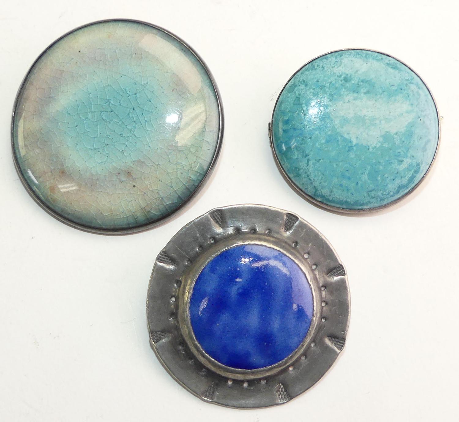signed ruskin silver brooch with 2 handmade enamel and glass brooches