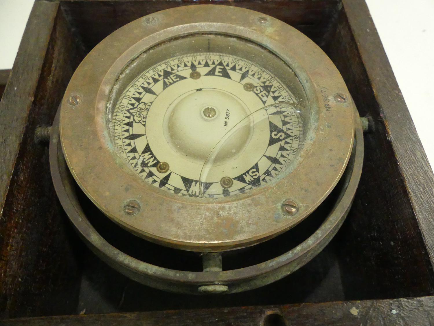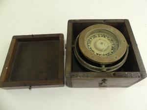 19th century cased marine compass, 6 1/2" x 6 1/2"
