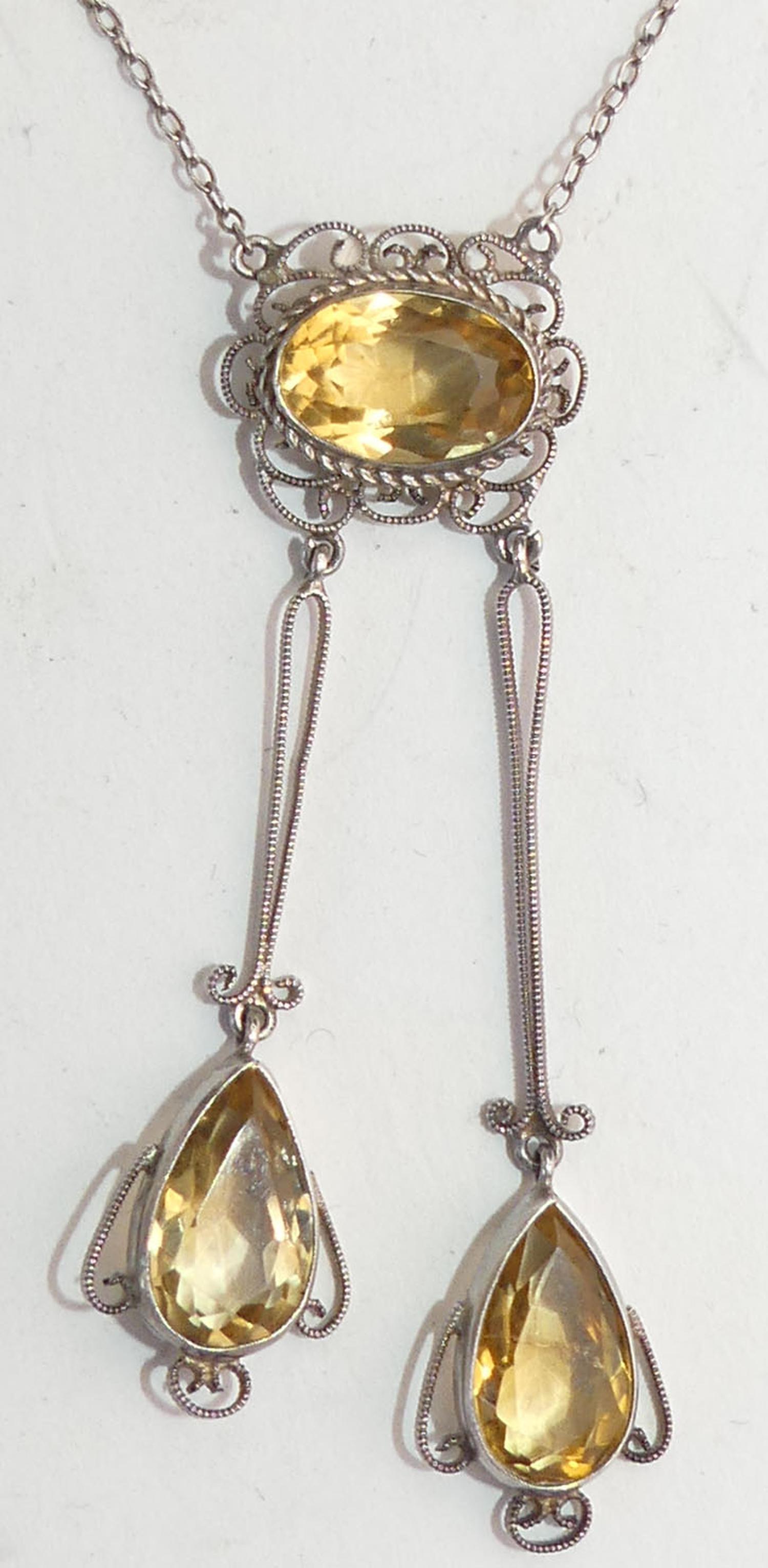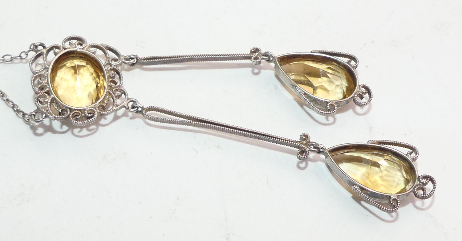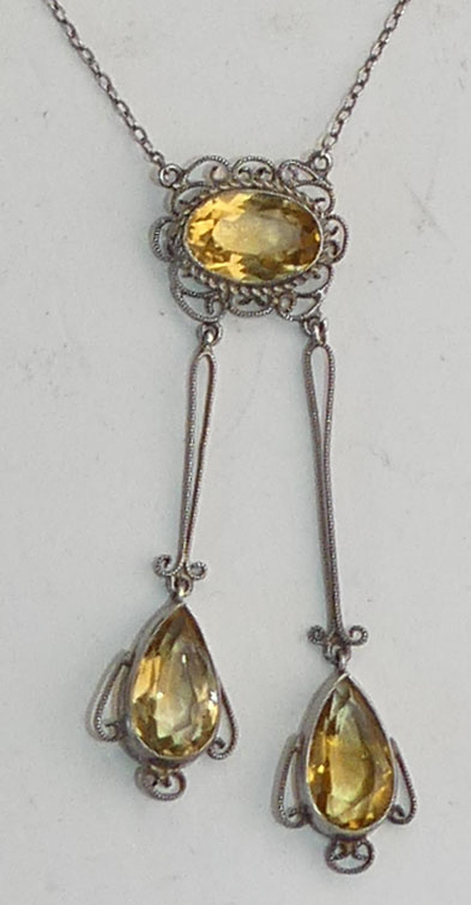 victorian silver filigree citrine pendant necklace, length 15", with 2 1/2" drop