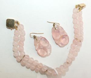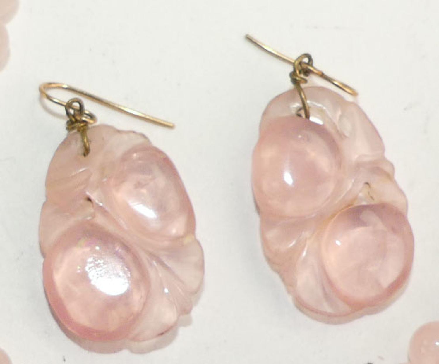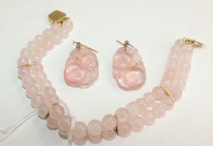 carved pink quartz earrings and bracelet, 14k gold fittings