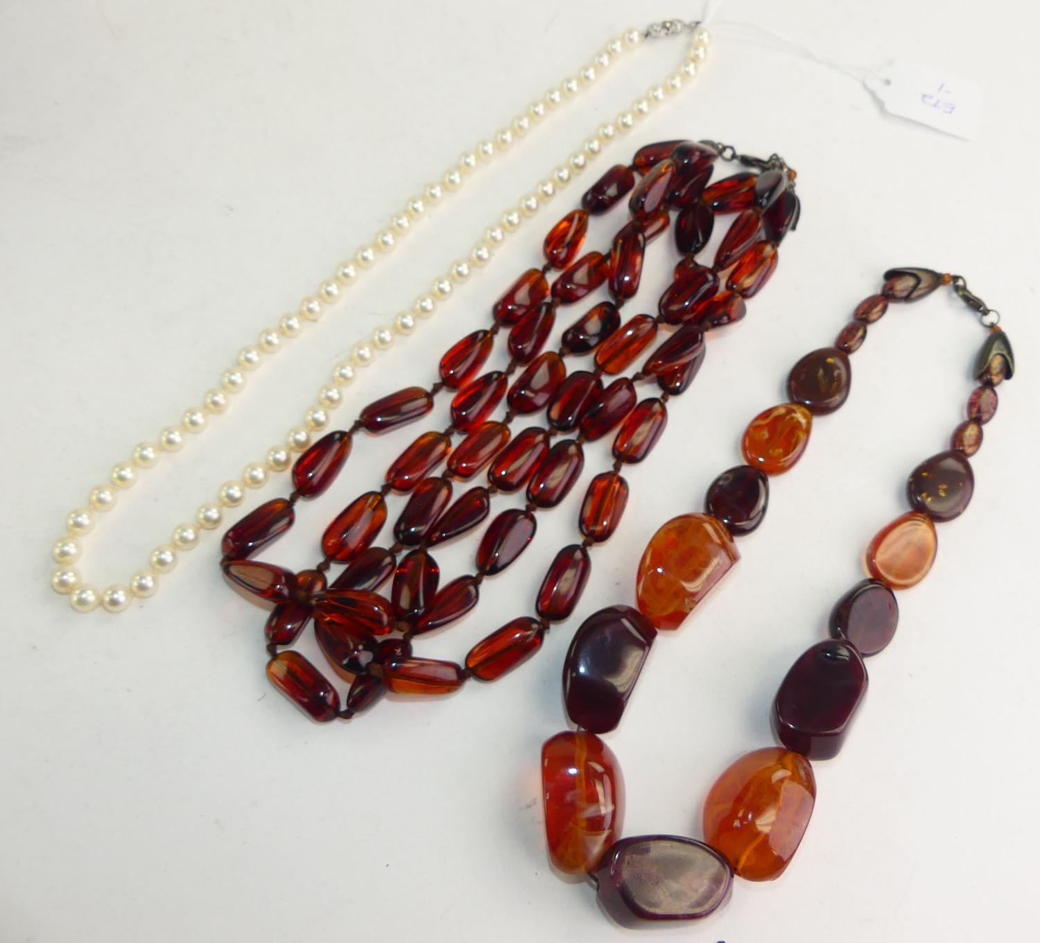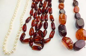 faux pearl necklace with rhinestone clasp, two mulitstrand lucite necklaces