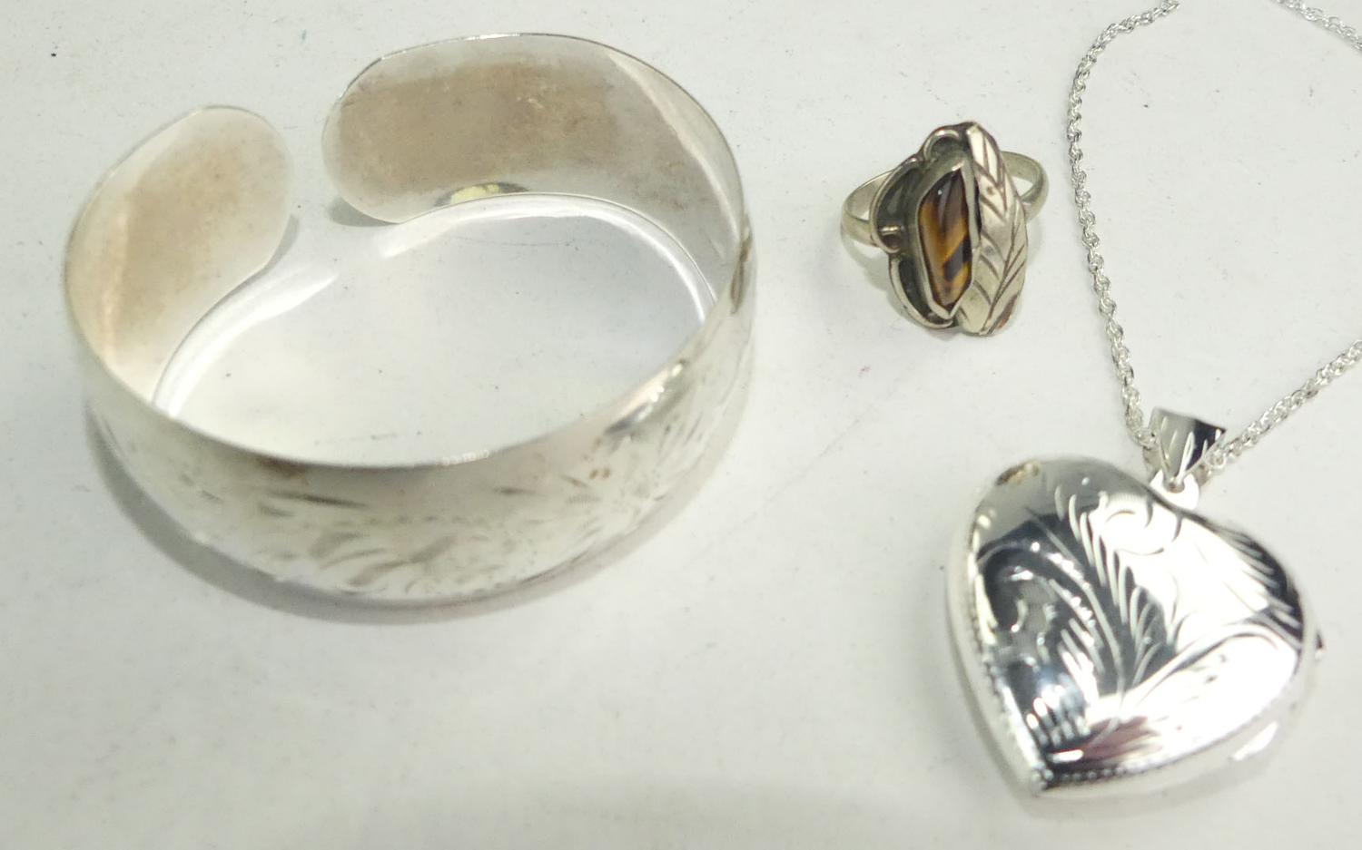 sterling silver cuff bracelet, tigers eye ring, and heart locket on chain, weighing approx 24 grams
