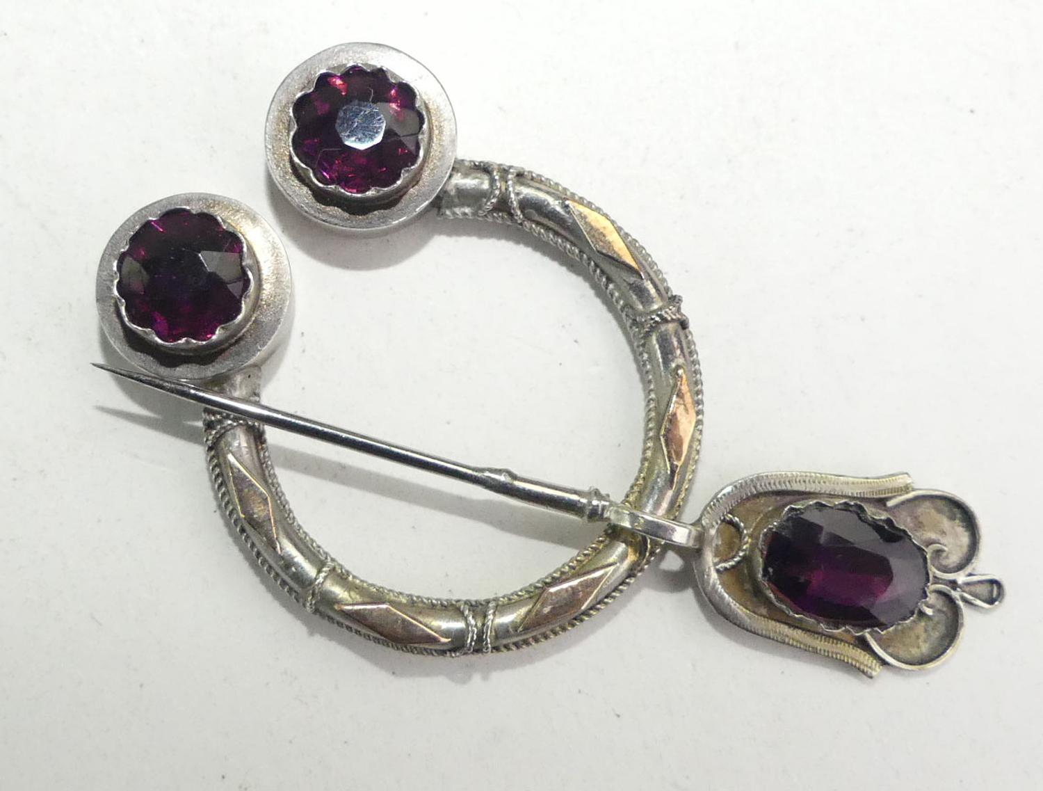 19th century scottish silver and gold paste fibula brooch, length 2 3/4", 8.5 grams
