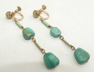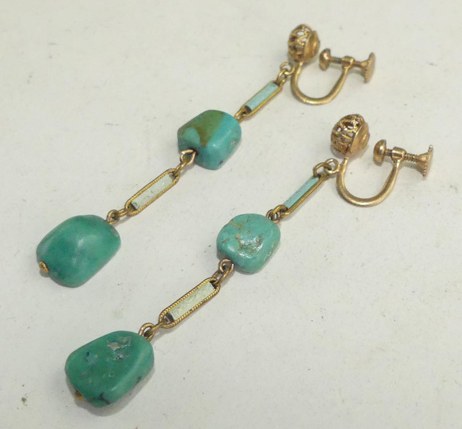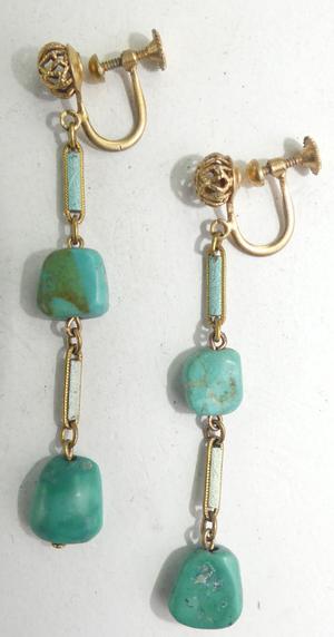 victorian gold filled filigree turquoise enamel drop earrings, height 2 1/2"