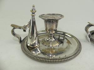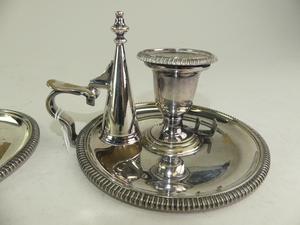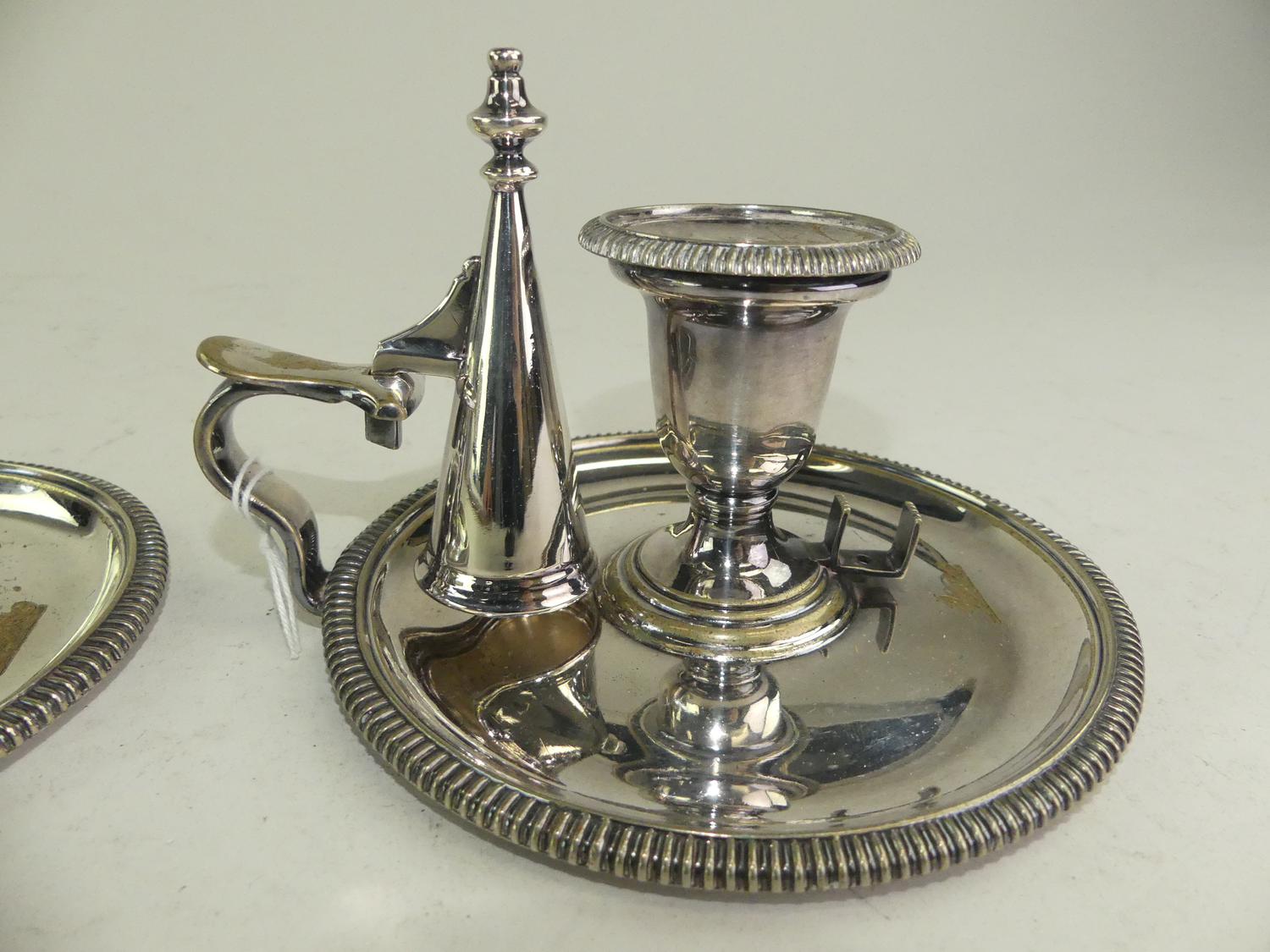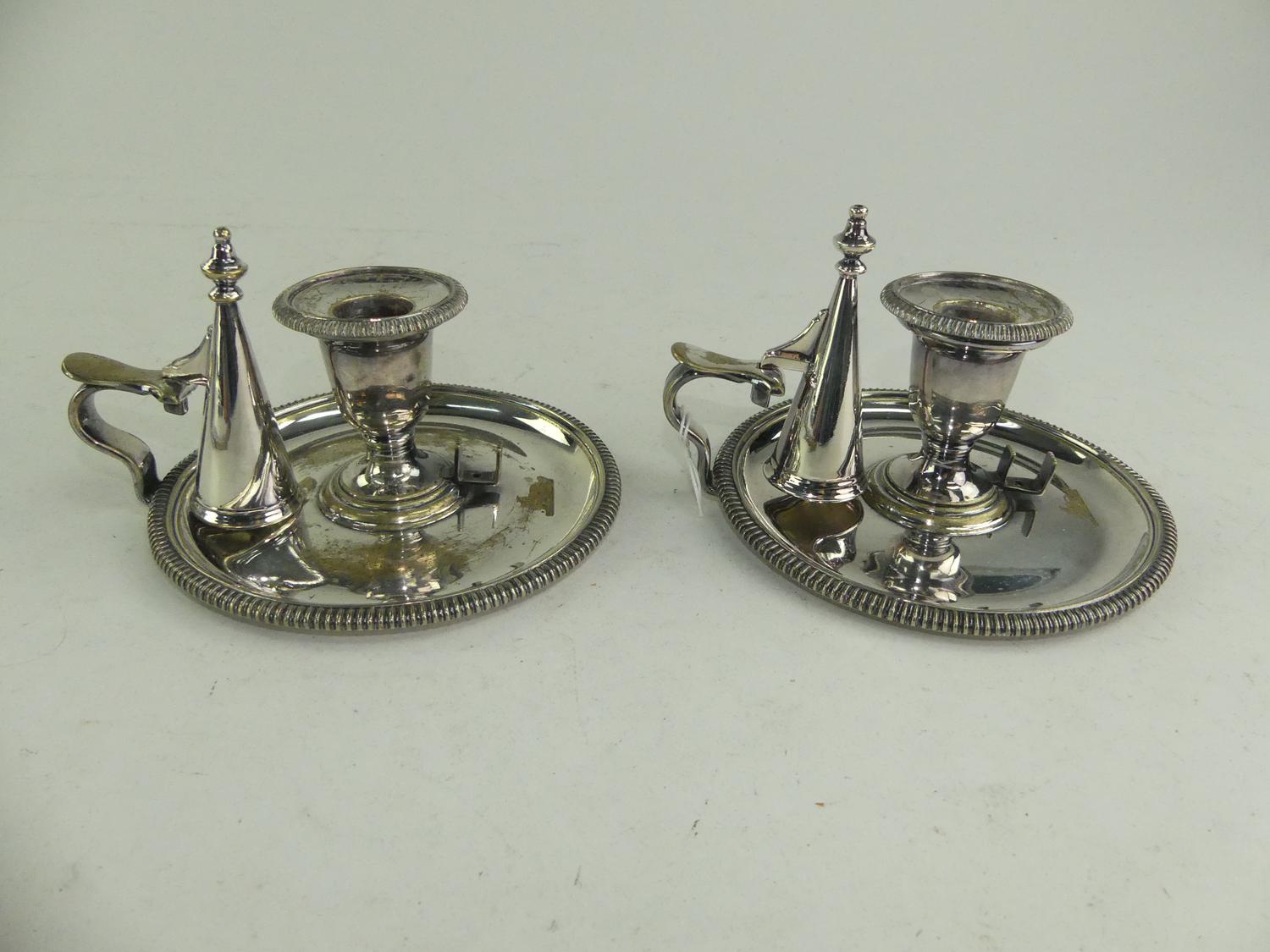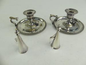 pair of antique sheffield silver plate chamber sticks, 4" x 6 1/2"