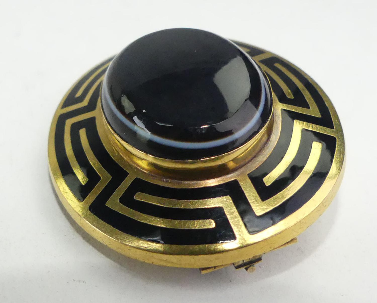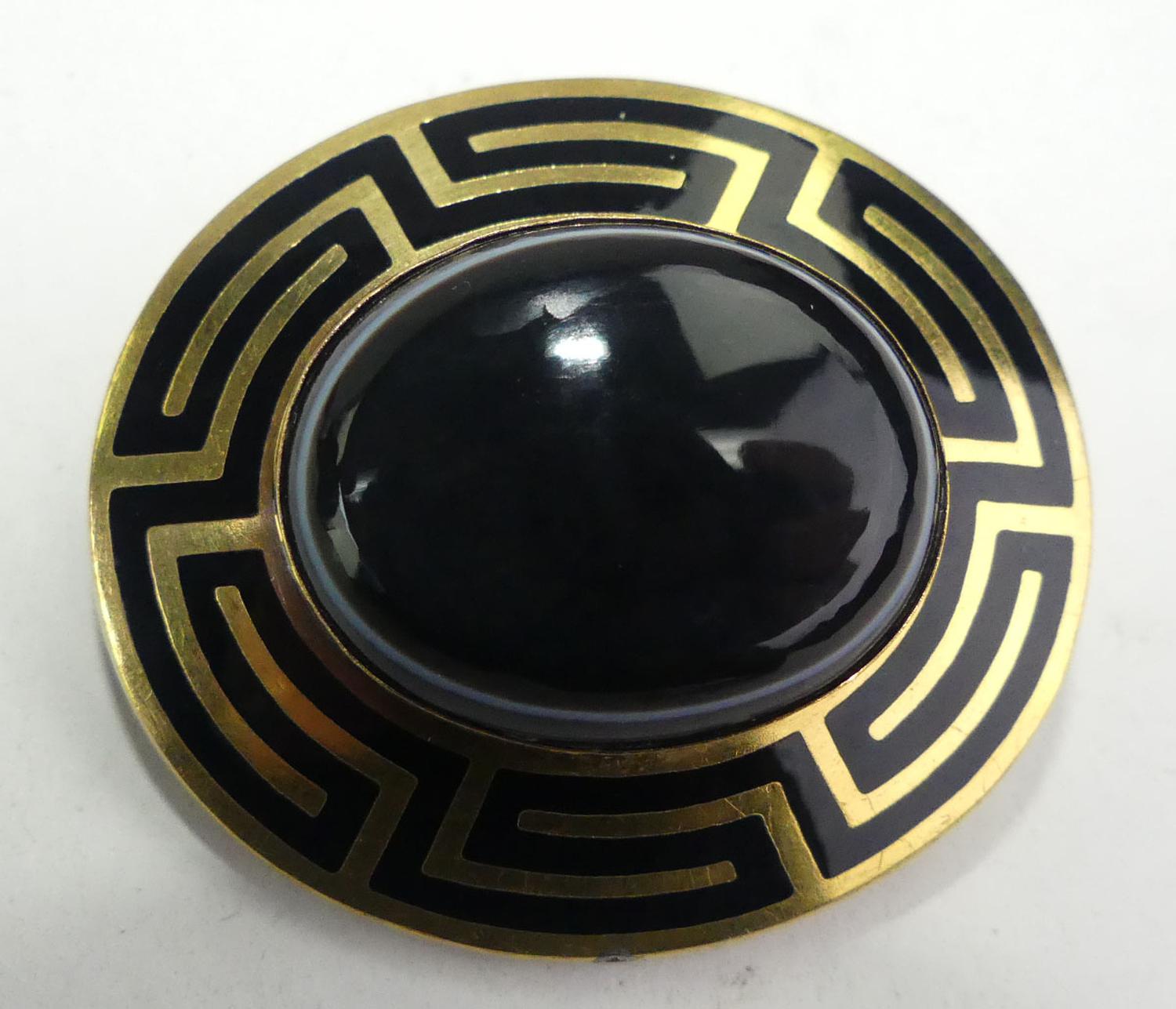 victorian gold banded agate brooch, greek key design enamel 14k gold and gilt, width 1 7/8"
