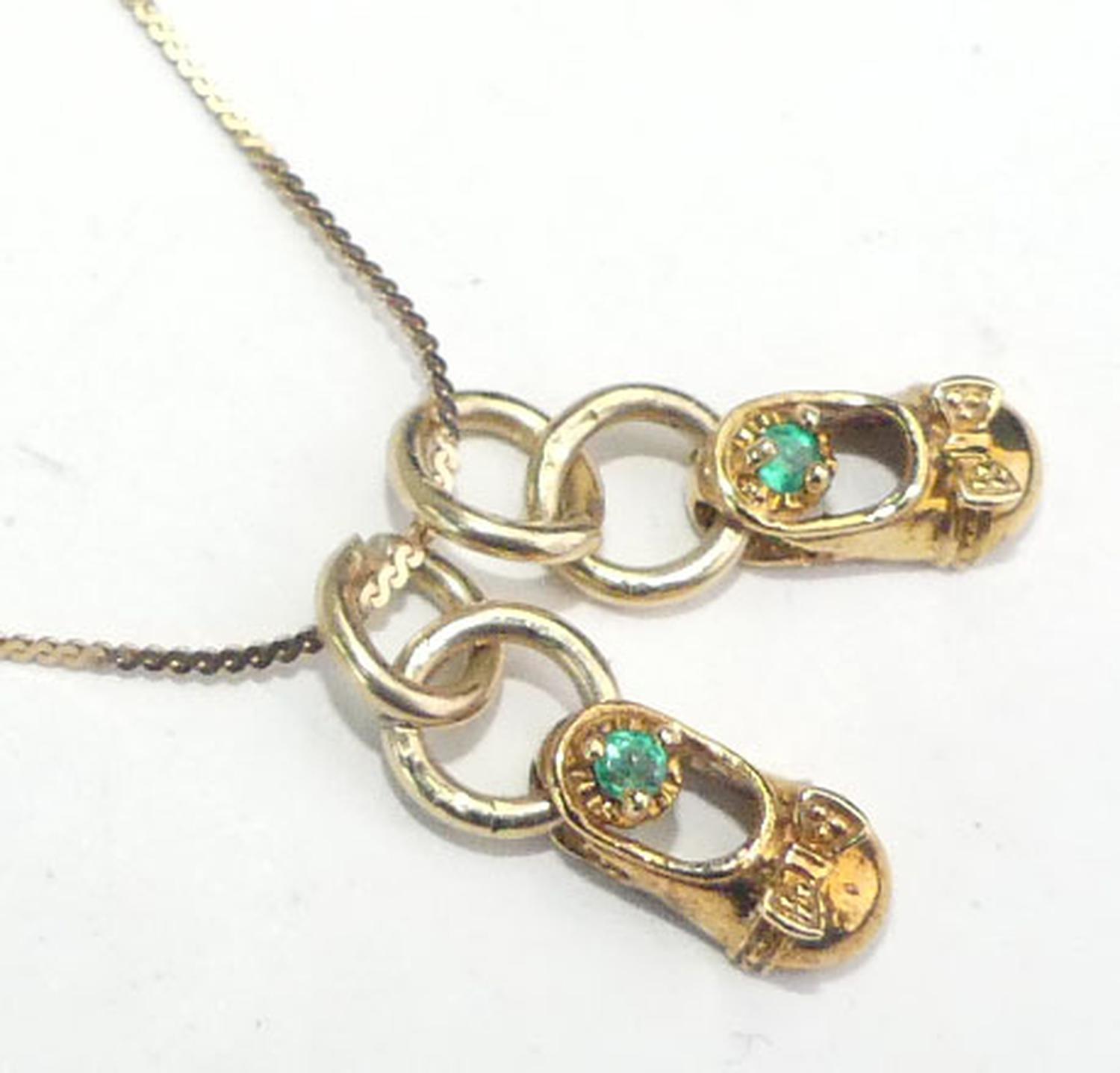 10k yellow gold baby shoe charm pendant necklace, set with emeralds, 16" in length, 2.8 grams