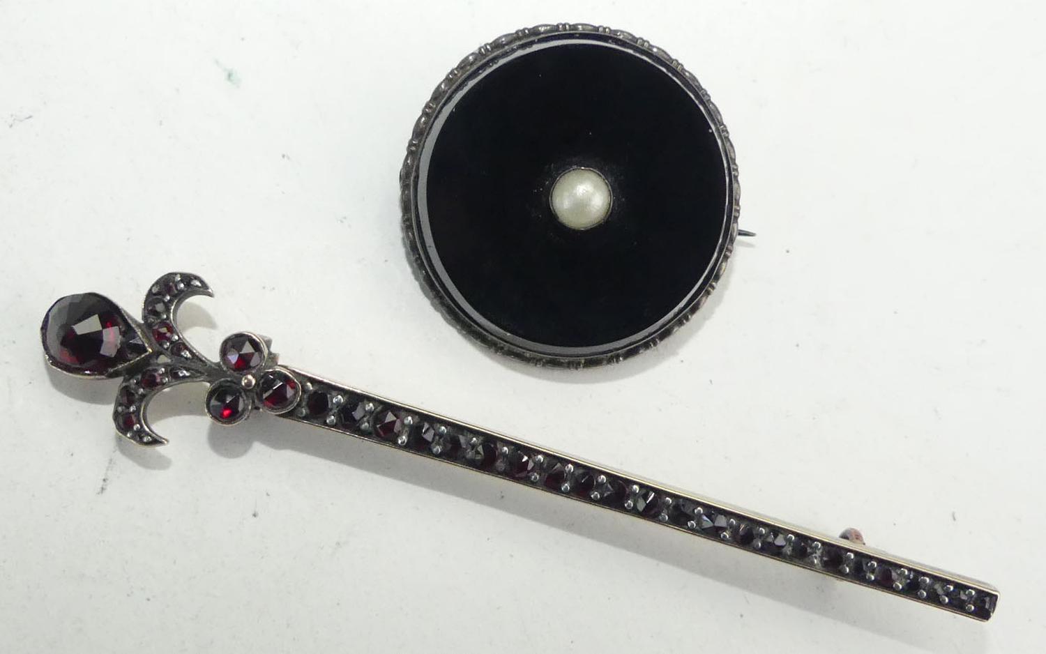 victorian silver gilt garnet brooch with onyx seed pearl pin, circa 1900s